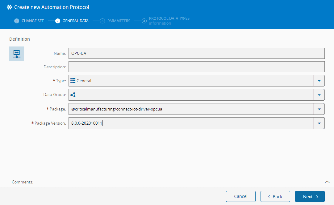 In the Business Data section of the main menu, navigate to the Automation Protocol tile and create a new entry. Provide a name for the Automation Protocol, bearing in mind that the name will identify the Protocol and will be used in the configuration of other entities, so make sure the name is meaningful for easy reference. Since we will be using a protocol based on the OPC-UA package, select the @criticalmanufacturing/connect-iot-driver-opcua package and whichever version is available and matching with the current installed version of the MES for maximum compatibility and select Next. An example of the values can be seen below: