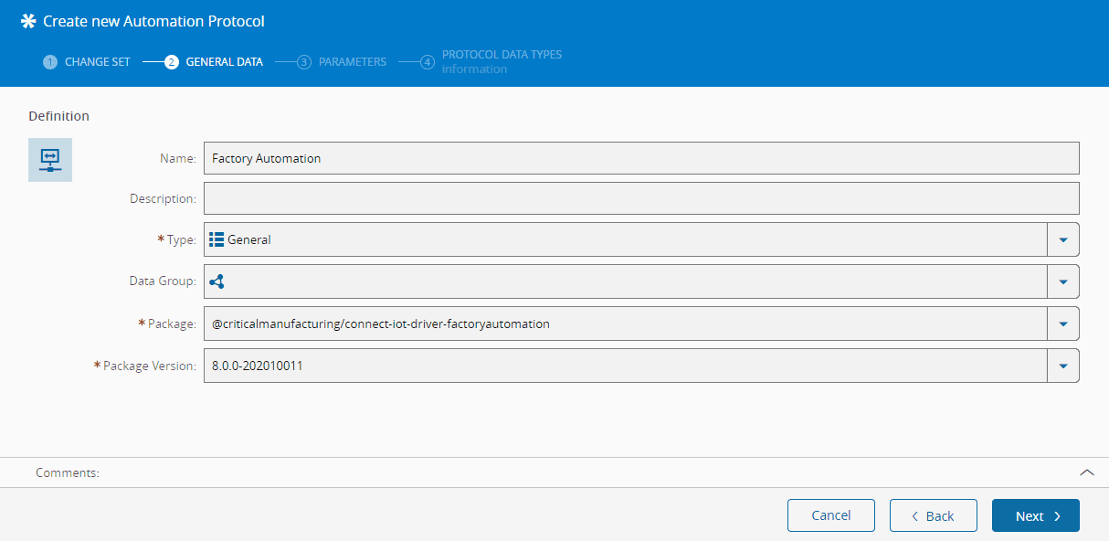 This second Automation Protocol will act upon the information retrieved by the first protocol, effectively decoupling both actions. Once again provide a name for the Automation Protocol, making sure the name is meaningful for later reference. This time we will use the Factory Automation package, so select the @criticalmanufacturing/connect-iot-driver-factoryautomation package along with the appropriate version and select Next. An example of the values can be seen below: