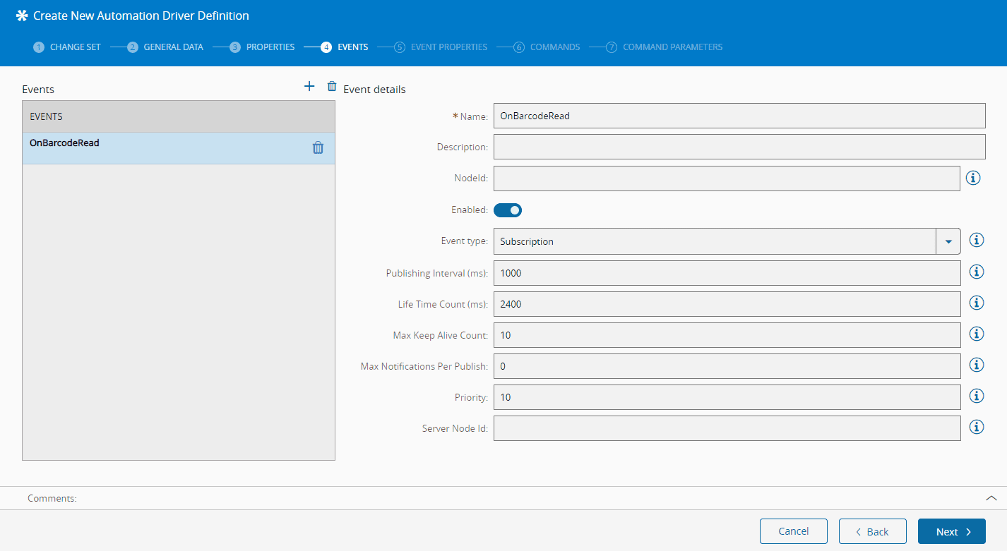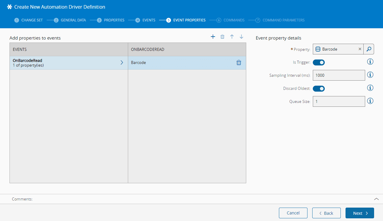 For the OnBarcodeRead event, add one new entry and select the Barcode property. Since no command will be created in the scope of this tutorial, we can jump over the Commands and Command Parameters panels and finish creating the Automation Driver Definition.