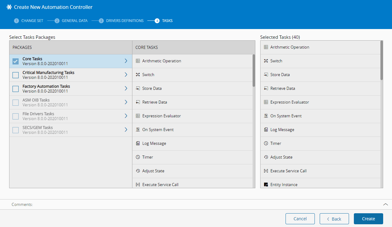 In the Tasks page, the Core and Factory Automation are already pre-selected due to the scope of the Automation Controller and cannot be unselected. Select Create to complete the process.