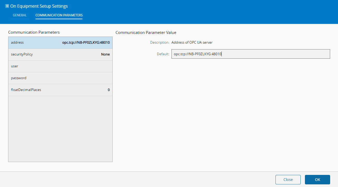 Let's now tell the workflow that we want to connect to a OPC-UA server. Opening the On Equipment Setup block settings by pressing the three dots on top right hand corner of the block and navigating to the Communication Parameters tab, we will specify the address of the OPC-UA server.