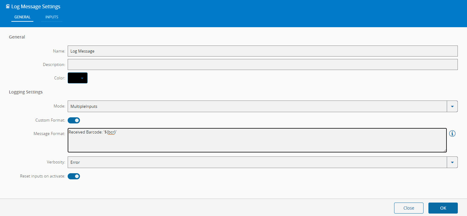 Saving the settings will allow linking both tasks through the Barcode property, which will automatically generate an input in the Log Message task.