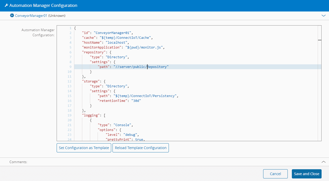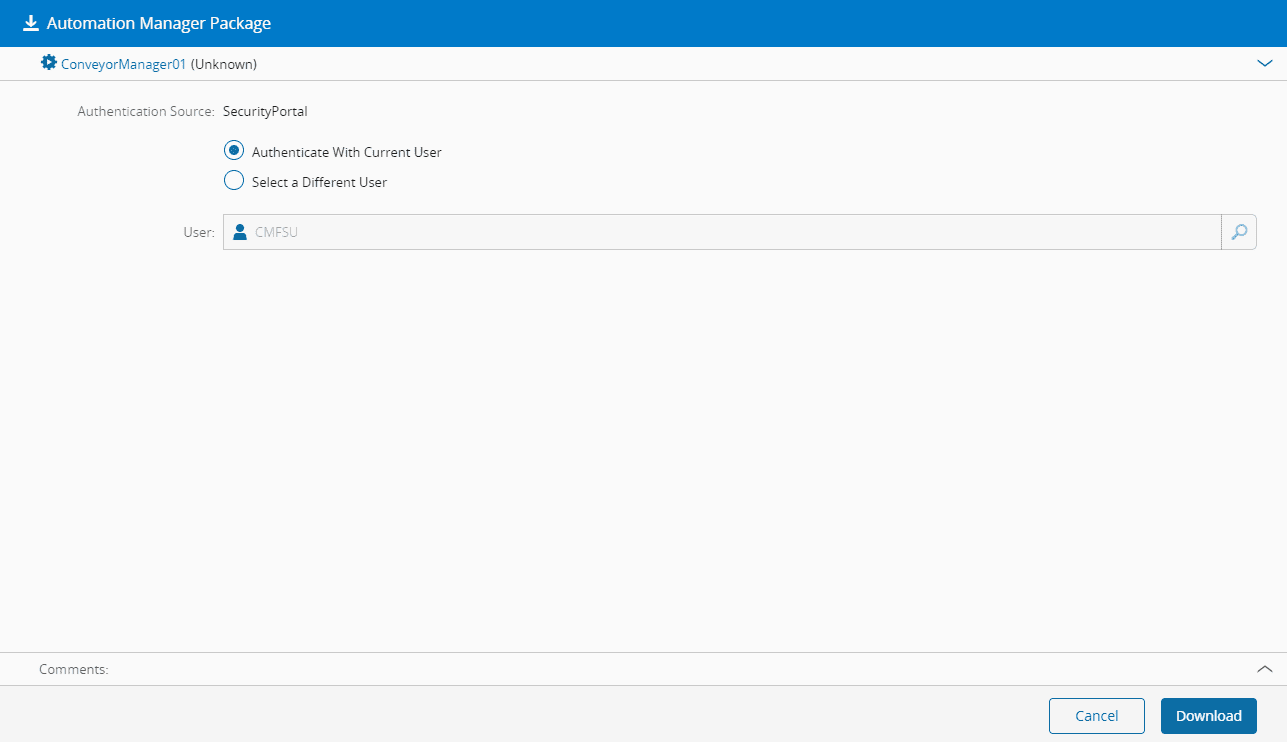 By pressing the Download button, we can get a compressed file with the entire configuration cloned from the default manager but updated with our own configuration values, set when creating the ConveyorManager01 Automation Manager.