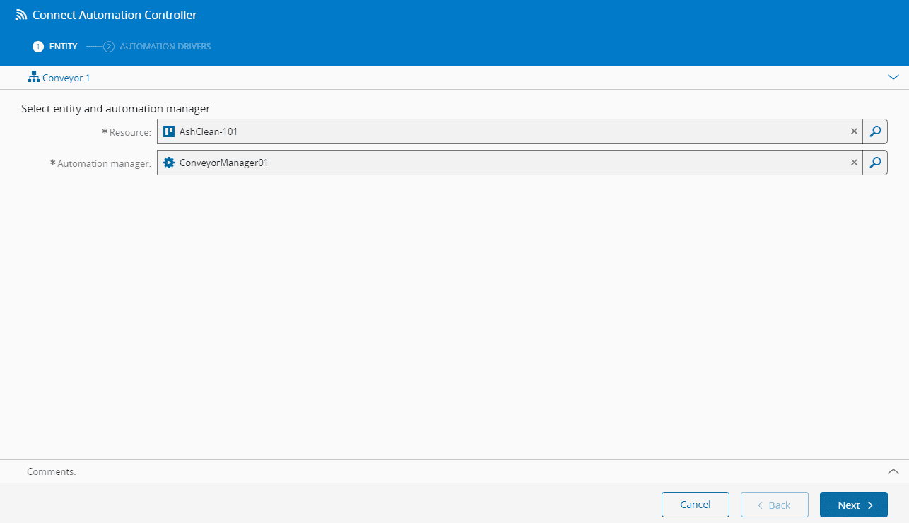 In the next panel, select the Automation Driver Definition created above. We can also select other driver definitions in order to enable connection to other machine types but in this case let's use the Conveyor driver definition created above, calling it "OPC UA Server". We will also select a different color for the tasks so that they can be easily distinguished in the workflow designer.