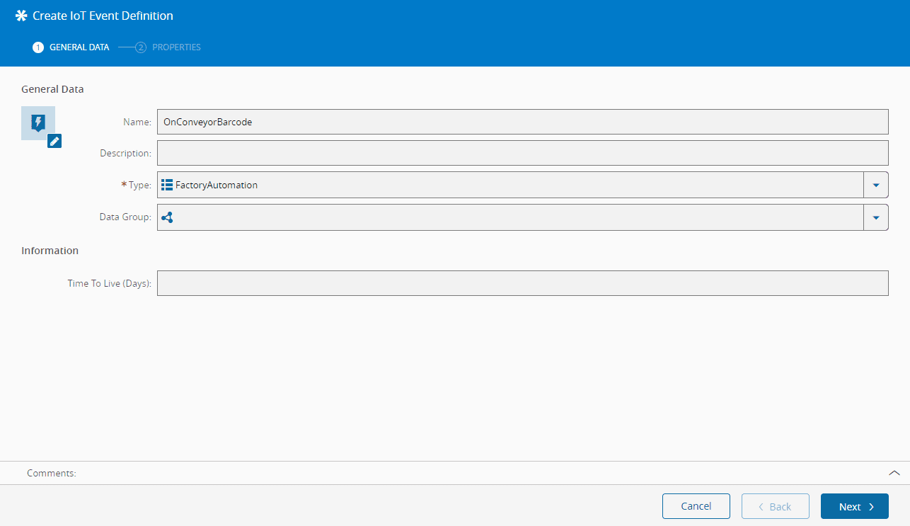 Since we changed the Scope to FactoryAutomation, instead of defining an event we will now be defining a IoT Event Definition. Select the OnConveyorBarcode we created earlier.