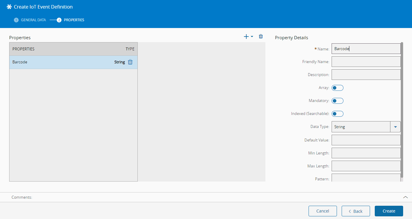 In the Properties panel, create the property that will contain the value that should be received from the barcode reader. Use the following values for the fields: