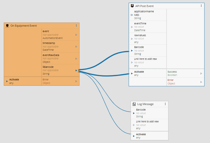 We can now link the Barcode property of OnEquipmentEvent that will hold the scanned Barcode and link it to the new API Post Event task, together with another link to activate the task.
