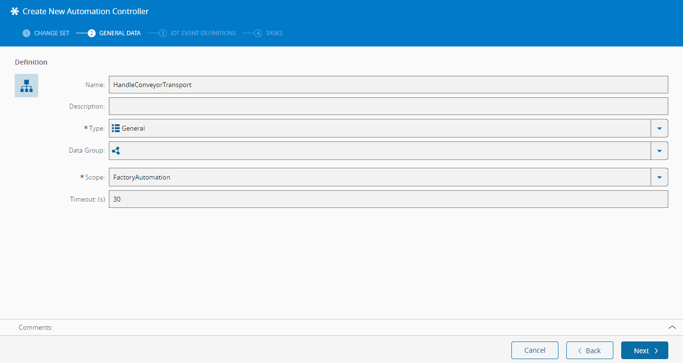 Finally, we can create the Factory Automation workflow that will process the event. Going to the Automation Controller section once again, we now create a new controller with the following values: