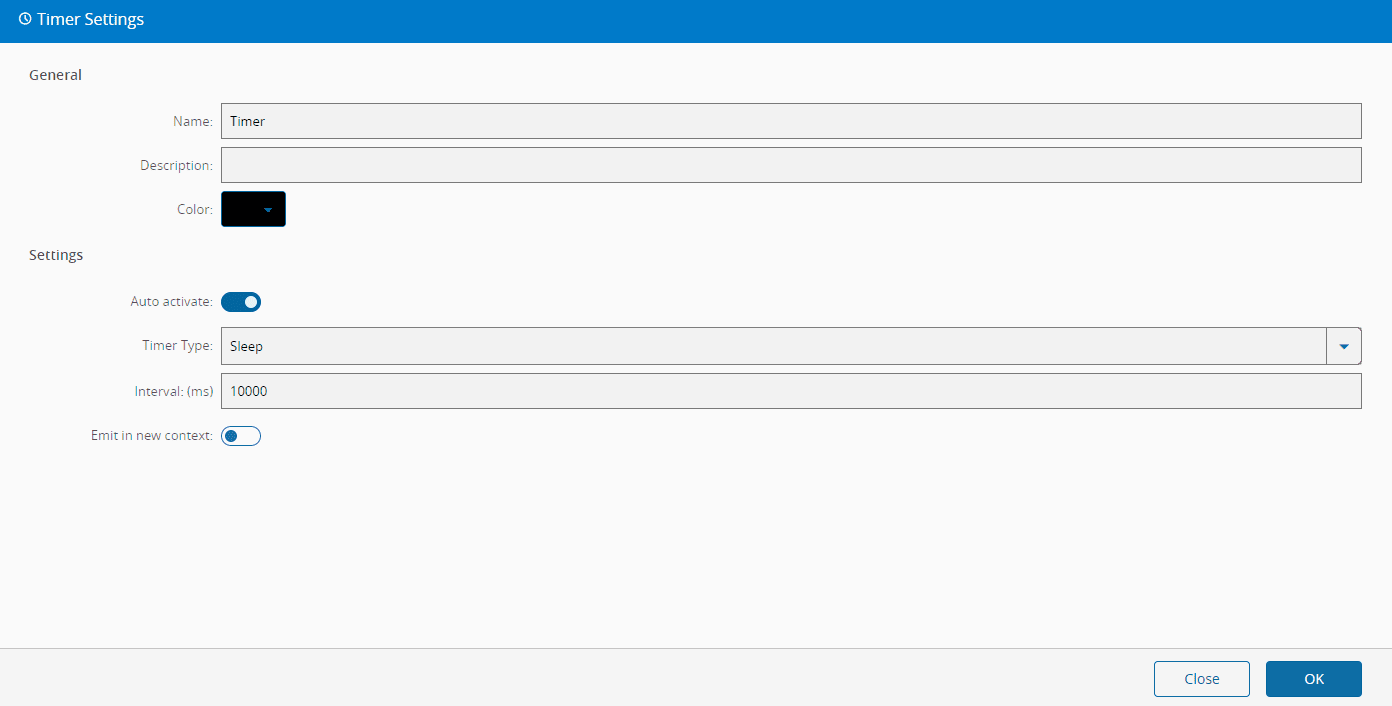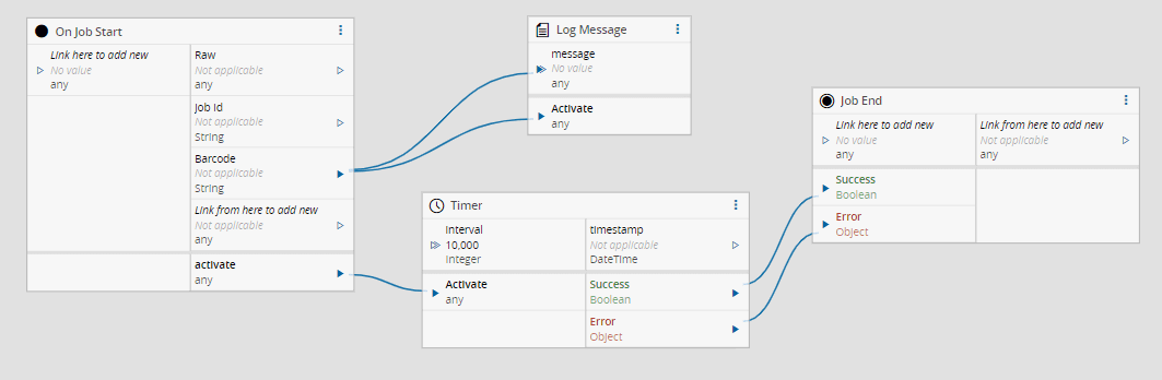 Since we already have the OnConveyorBarcode event definition selected, the Barcode property will be automatically added to the On Job Start task. Let us add some logging and a new Timer task to the canvas, configuring a sleep period of 10 seconds before doing anything. Link the Success and Error outputs of the Timer to the same inputs of the Job End task.