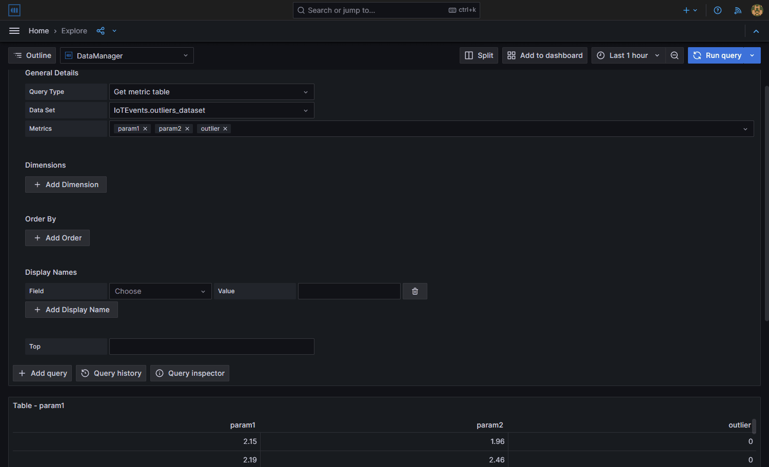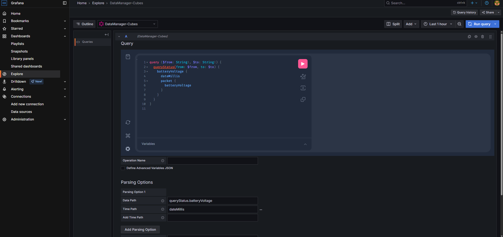 1. Navigate to the Explore section in Grafana and select the Data Manager as your data source.