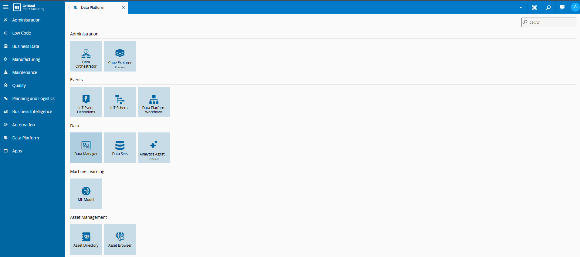 To access Data Manager, in MES, navigate to Data Platform, and select Data Manager.
