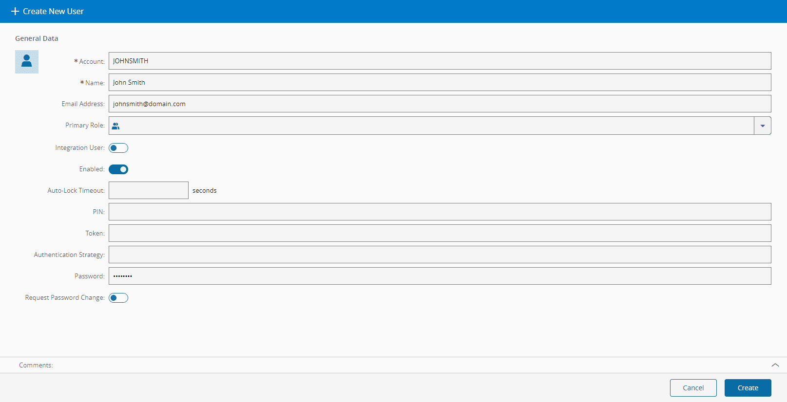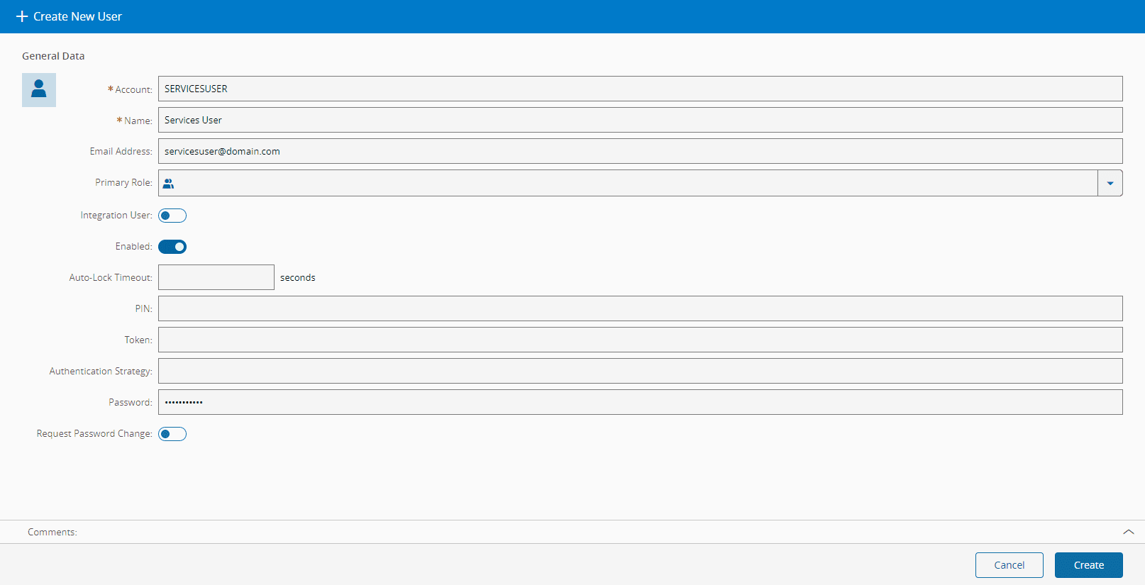 click A3 "../../userguide/business-data/certification" Begin by creating the Users and Employees for the scenario where you have one Trainer and one Trainee. Considering a situation where there are no system objects created and you are starting from a clean system. First of all, create the User for the Trainer by going to the Security entity in the Administration menu, accessing the Users section, and creating a new User, which in this case is the Services User you see below: