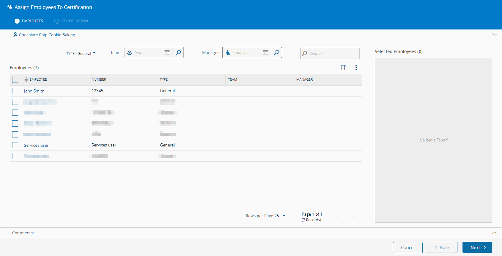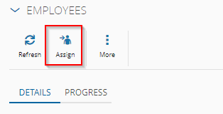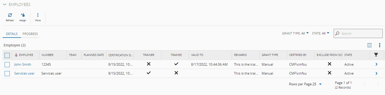With all objects now created, assign the Certification to both Employees. Open the Certification you created, navigate to the Employees section in the Details view and select Assign located on top of the grid: