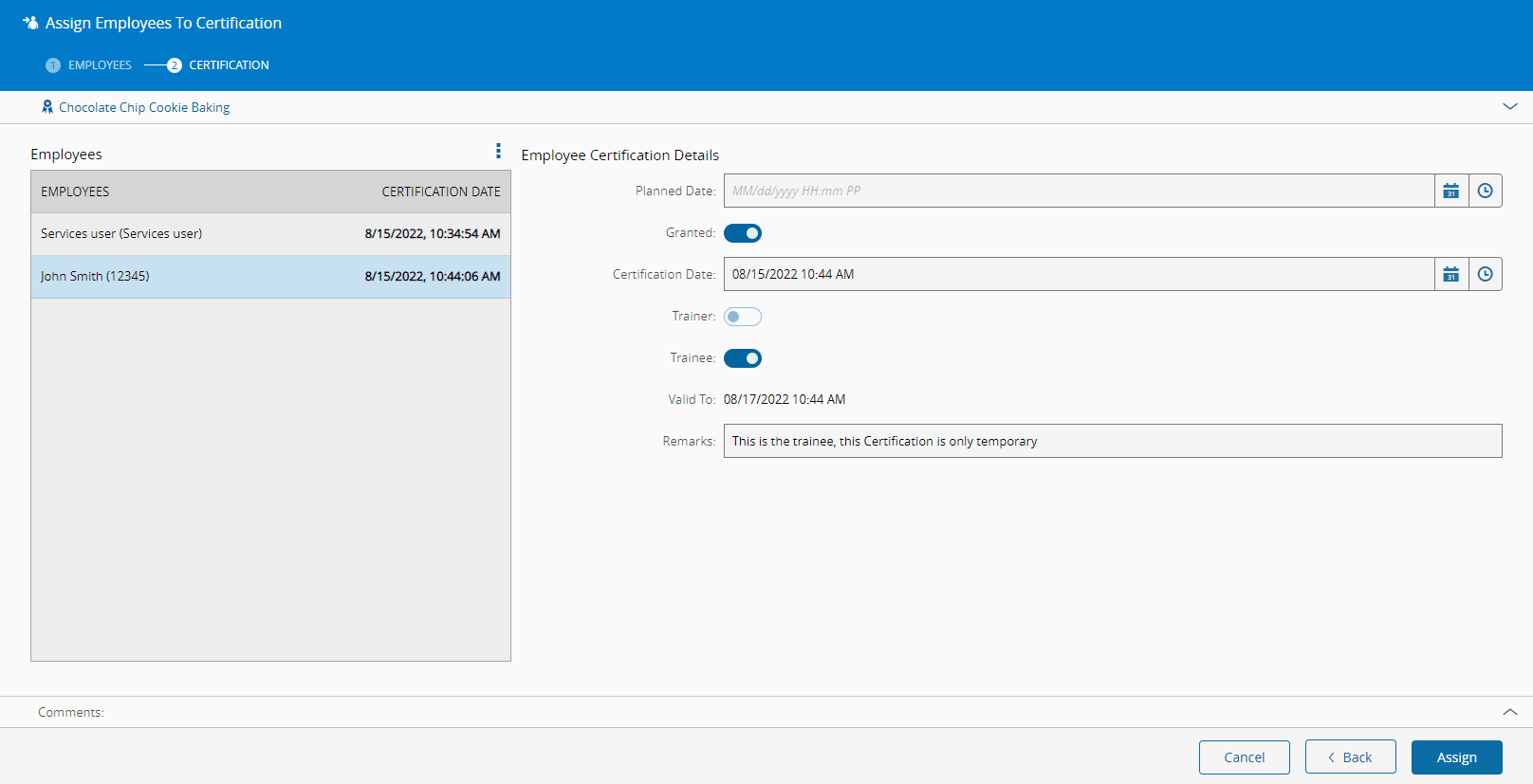 In this section you can configure the Certification assignment for both Employees. Ensure that the Trainer and Trainee are configured accordingly: