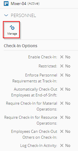 Navigating to the Business Data menu, select the Resource entity and open the Resource you want to configure. Navigate to the Personnel section in the Details view and select Manage located on top of the grid: