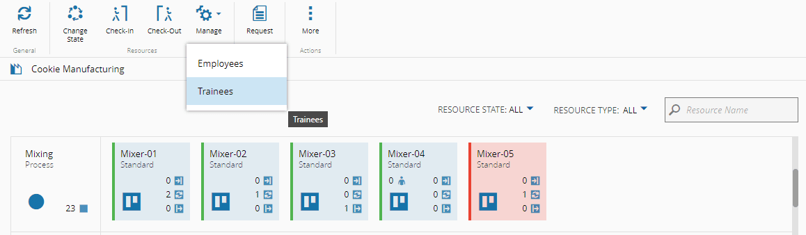 Using the Area View provides the extra advantage to check-in or check-out multiple Employees at multiple Resources in the Manage Resources Trainees wizard.