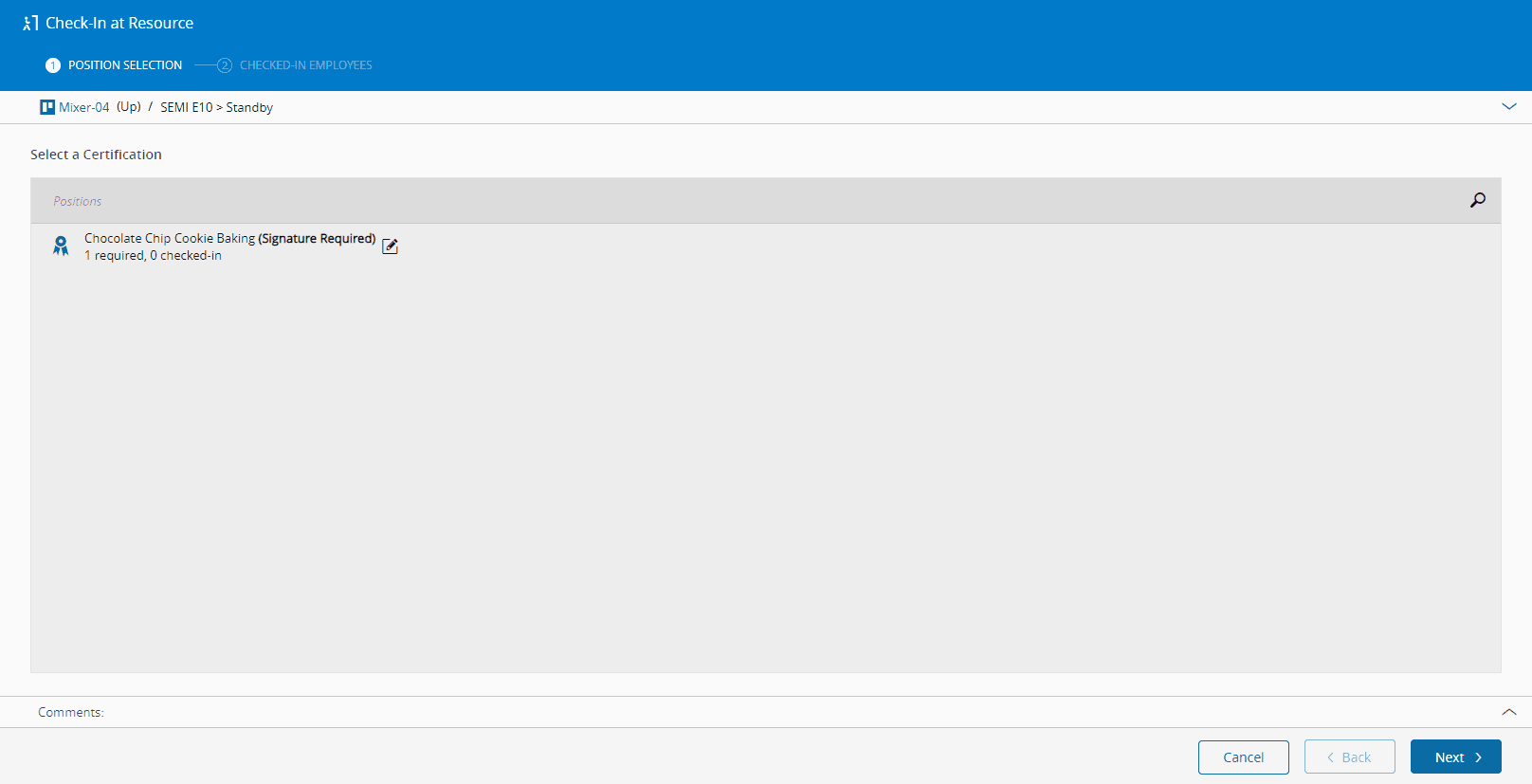 Select the Certification and proceed to the next step, since there are no other Employees checked-in. When attempting to complete the check-in process, a window will be displayed requiring a signature from a defined Trainer for that Certification in that Resource: