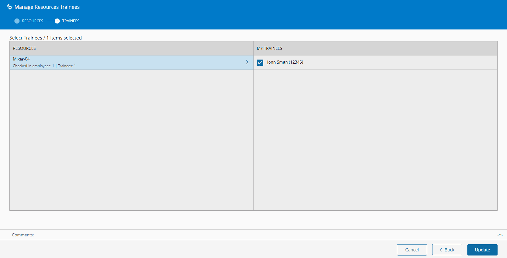 In this wizard, a Trainer can manage which of the trainees is logged into a specific Resource and perform check-in/check-out operations by selecting/deselecting the flag next to the Trainee.