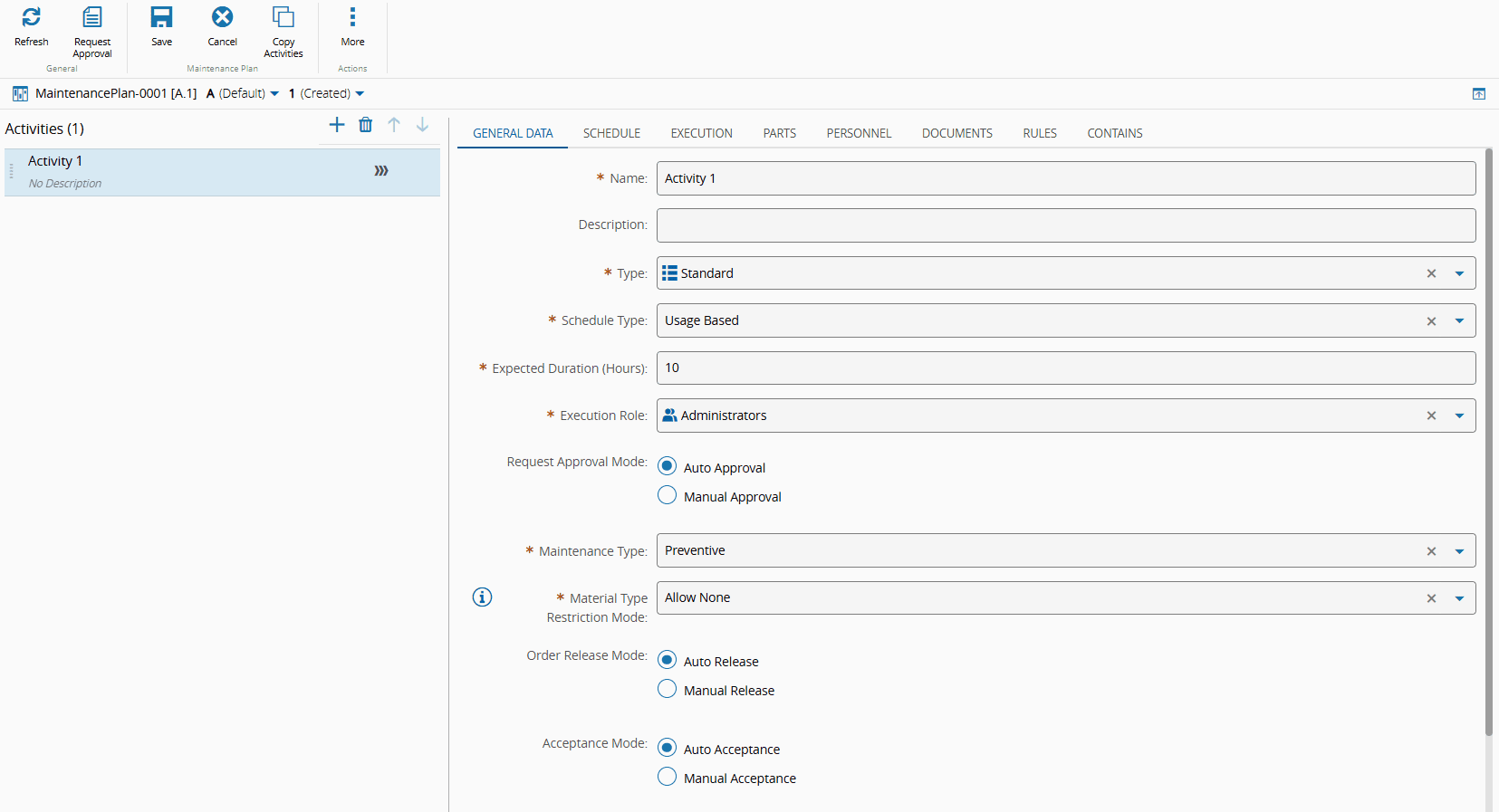 • Name - enter a name for the Maintenance Activity (for example, Activity 1).