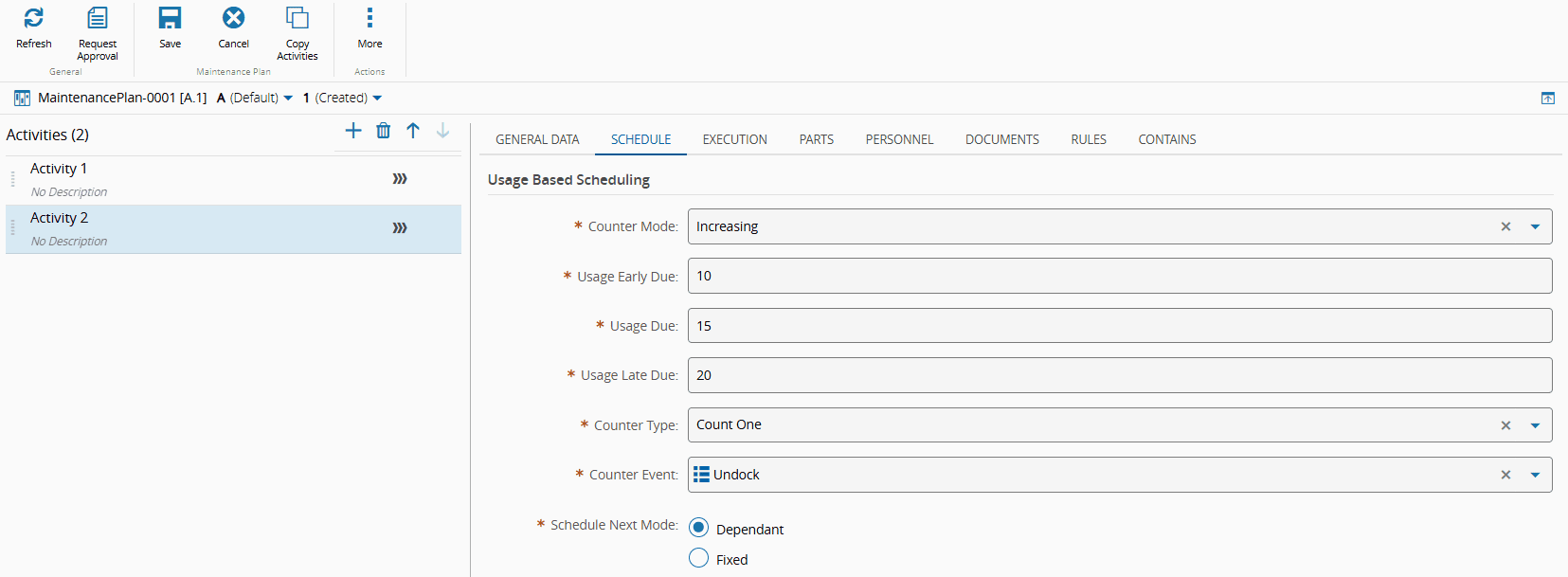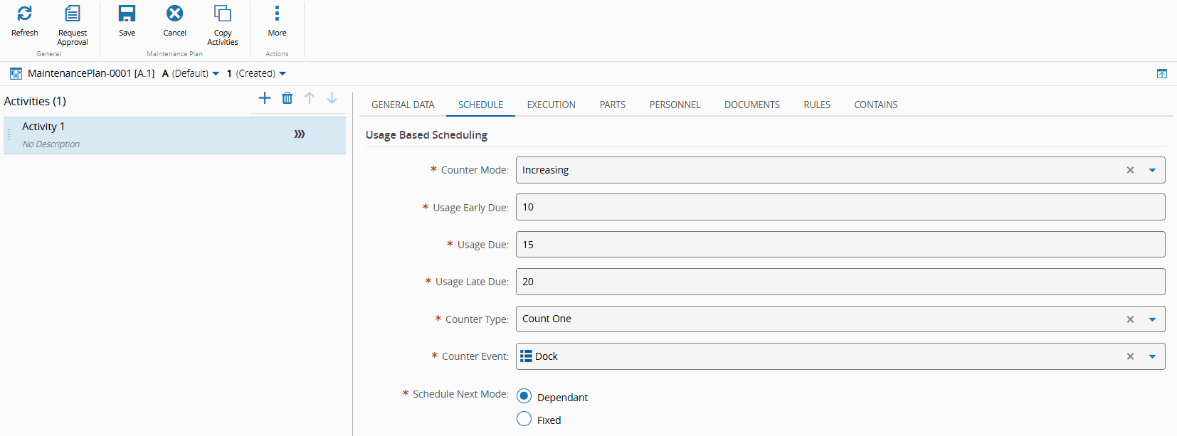 • Schedule Next Mode - indicate if the subsequent Maintenance Activities depend on completing the current activity (in this example, Dependant).