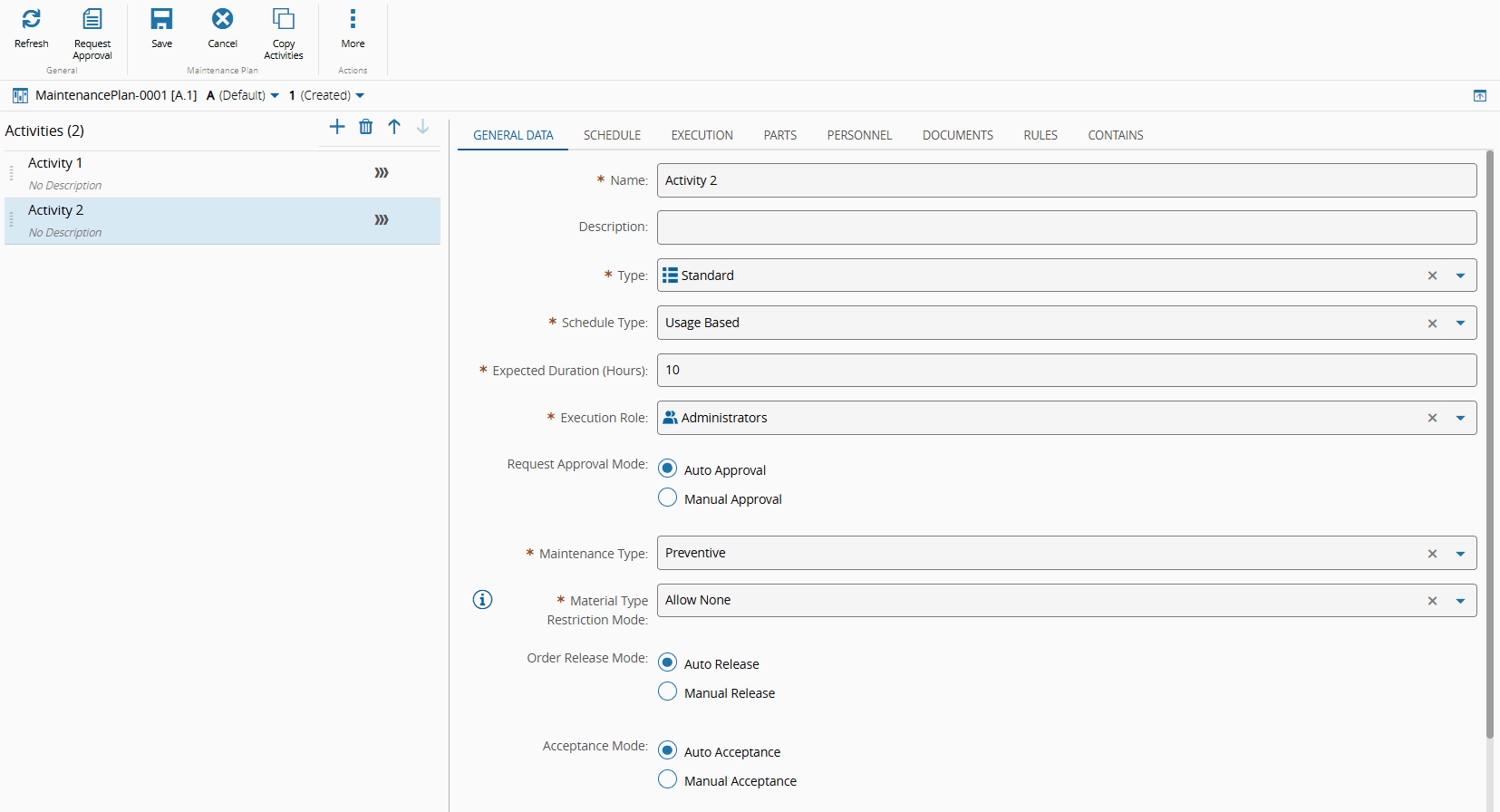 Additional configurations can be set when adding Maintenance Activities, but for simplicity, only key configurations relevant to this scenario are shown. For detailed information, see Create Maintenance Plan, How to Create a Maintenance Plan, and How to Add Maintenance Activities.