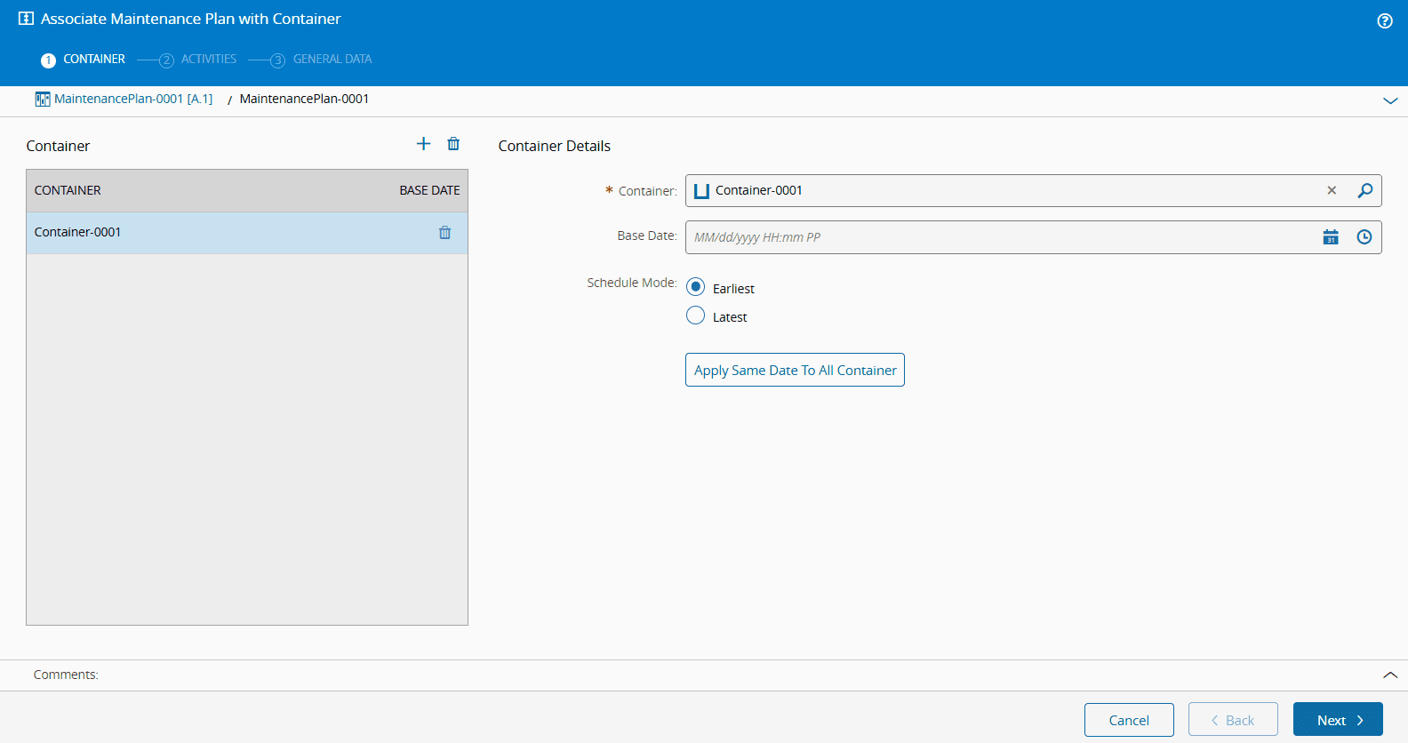 Once you've completed the previous steps, you can begin tracking the Container usage. First, open the Maintenance Plan instance associated with your Container (in this example, MaintenancePlan-0001-Container-0001-0001).