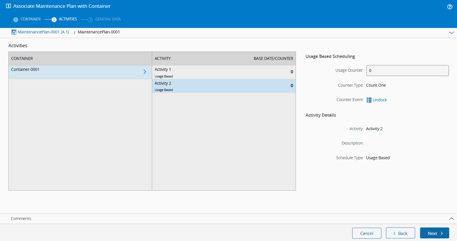 Navigate to the Maintenance Schedule view and open the Maintenance Activities you've defined (such as Activity 1 and Activity 2). Within each activity page, locate the Scheduling section under the Details view. Here, you'll see the associated events configured for each activity. Initially, before any Container operations occur, the Usage field will display a value of zero. For example, Activity 1 will show the Usage as CountOne at Dock: 0, and Activity 2 will show CountOne at Undock: 0.