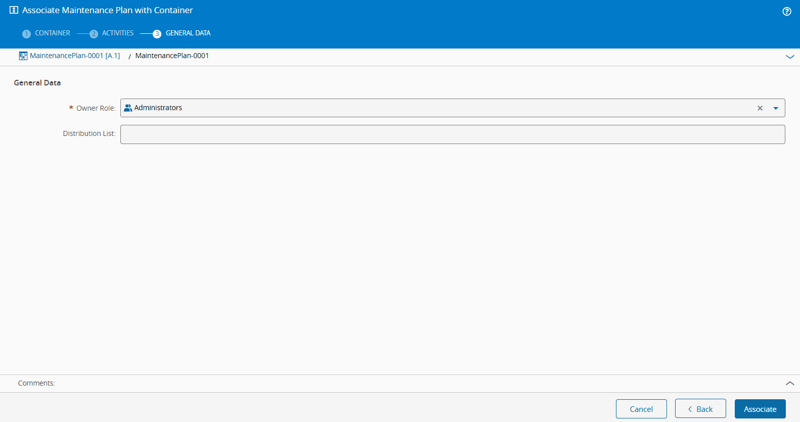 Next, associate the MaintenancePlan-0001 with Container-0001 by selecting the Associate With button from the top ribbon and choose Container. Add the Maintenance Activities associated to the Maintenance Plan you have created and choose the Owner Role (in this example, Administrators). For more information, see How to Associate an MP with an Entity.