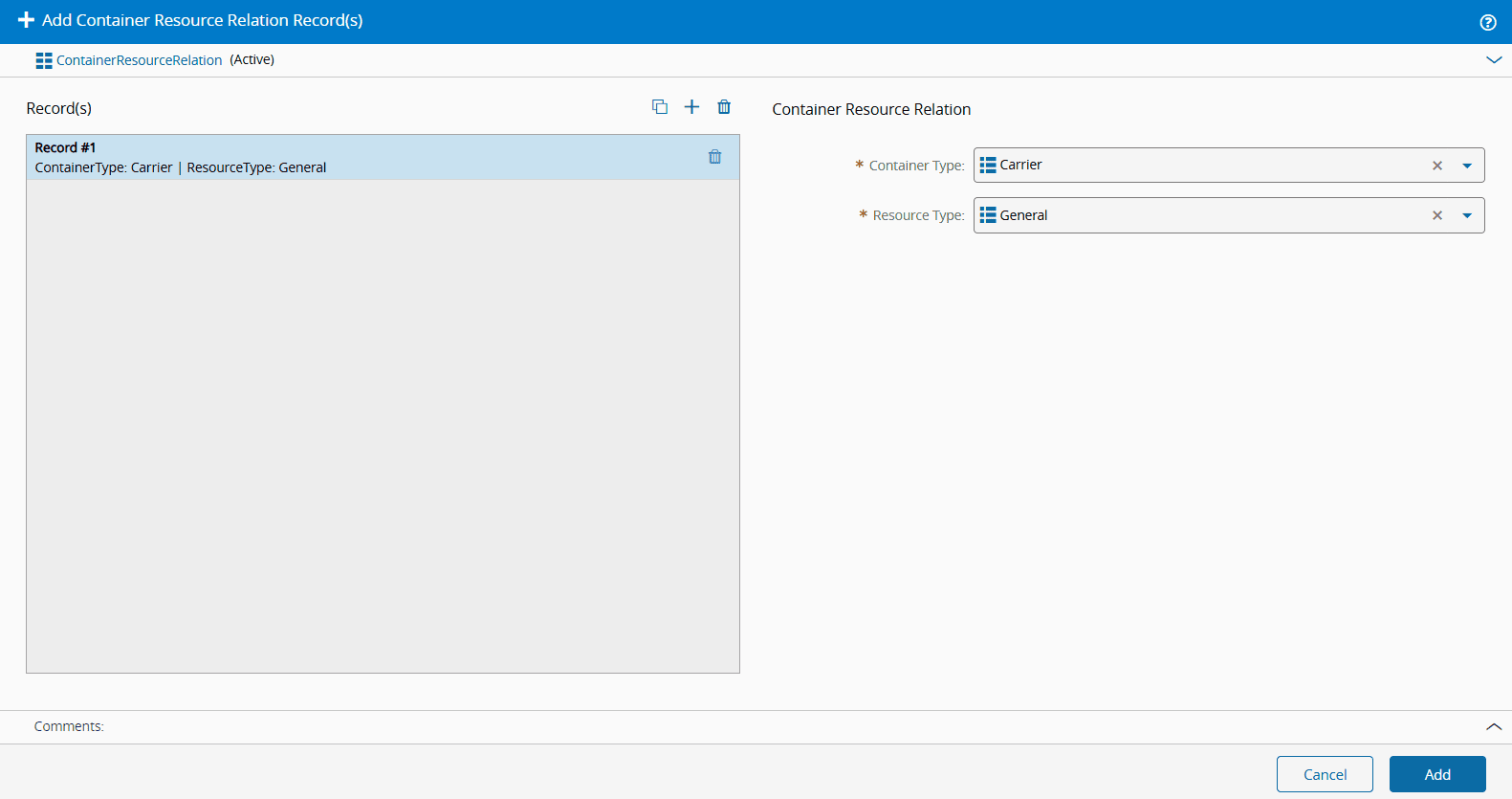 Afterwards, add the Container you created to the Sub-Resource LoadPort-0001. First, add a new entry to the ContainerResourceRelation Generic Table, specifying the chosen Container Type (in this example, Carrier) and the matching Resource Type (in this example, Carrier). Confirm by selecting Add to complete this association.