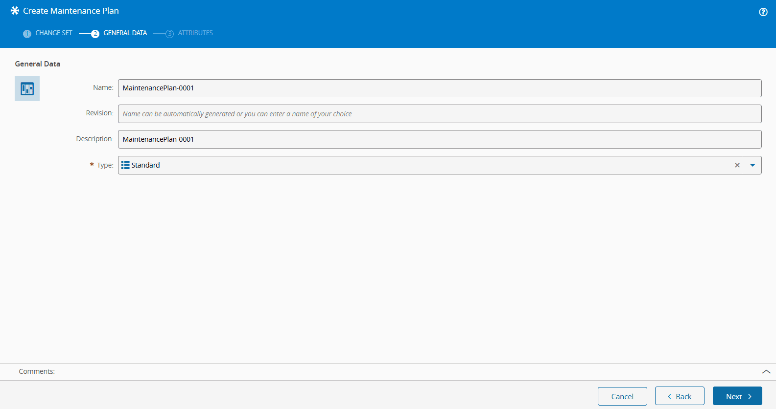 After choosing the Change Set, add the following details to the General Data of the Create Maintenance Plan wizard:
