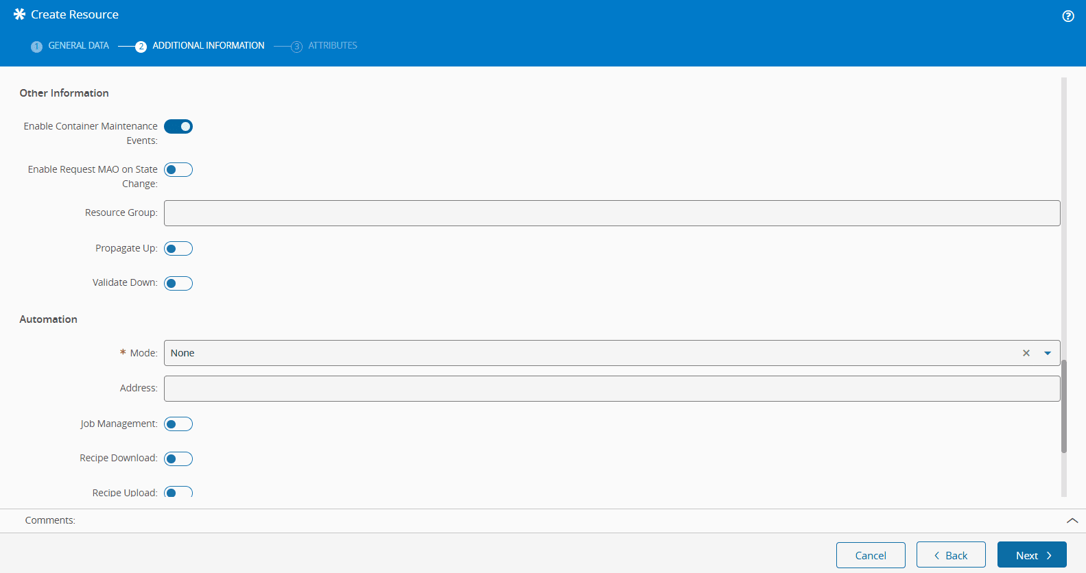 Select Next to proceed to the Attributes step. For more information, see Attributes. If no attributes are defined, select Create to complete the operation.