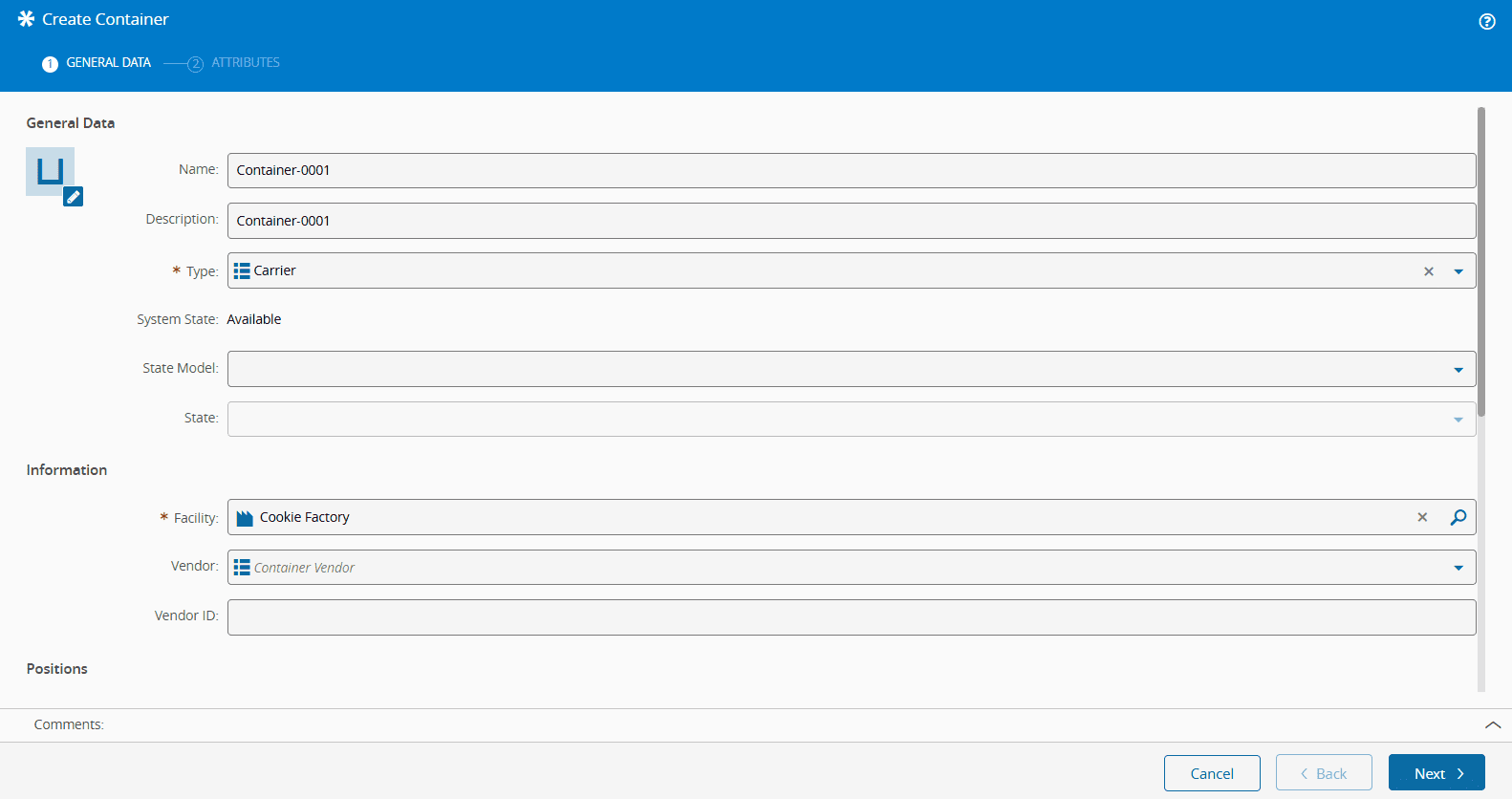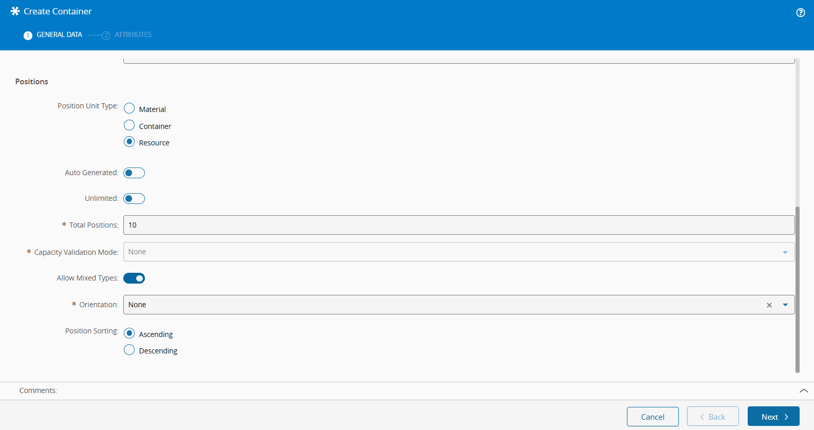 • Total Positions - define the total number of positions for the Container (for example, 10).