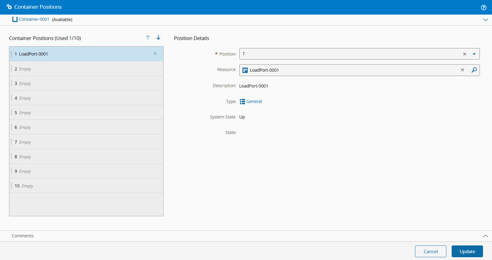 Next, navigate to the Container-0001 page and select the Manage Positions button from the top ribbon. Since the Container was previously configured with a Resource position unit type, you will now be able to add Resources in the Container Positions wizard. Add the LoadPort-0001 Resource to the first position of Container-0001. Select Update to finalize the operation.