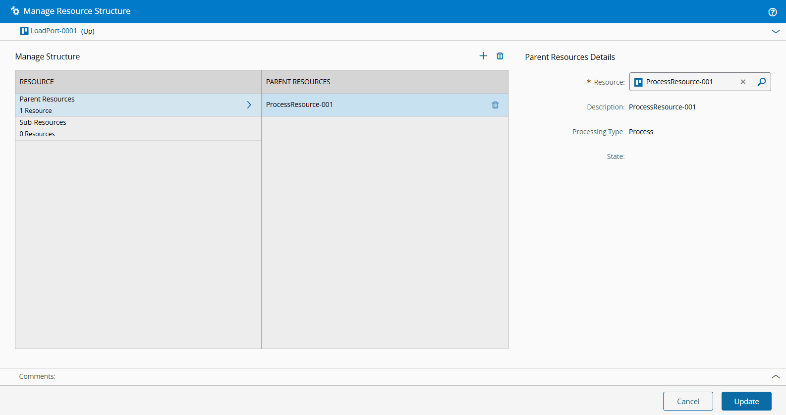 After creating the Sub-Resource, in the Structure section of the Details view, choose the Manage button. This will open the Manage Resource Structure wizard. Add ProcessResource-001 as Parent Resource to LoadPort-0001 and select Update to complete the operation, as shown in the image below. For more information, see How to: Manage Resource Structure.