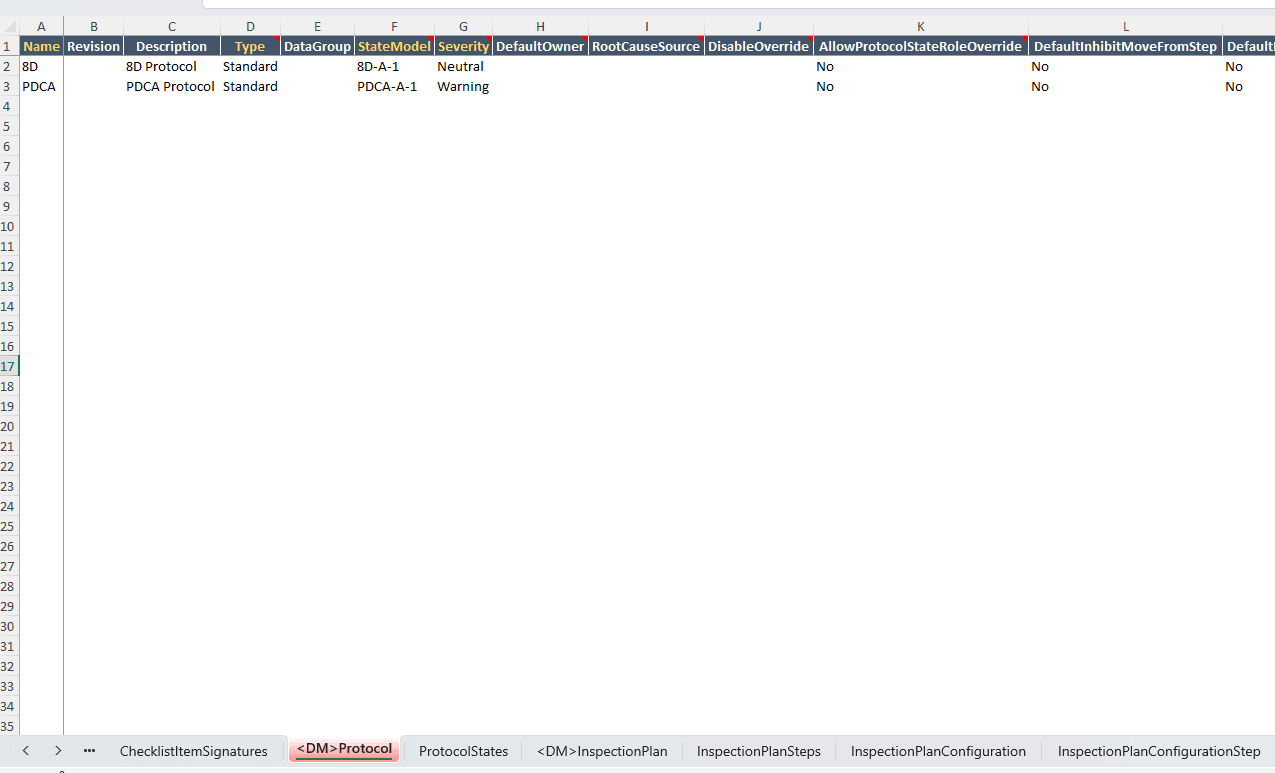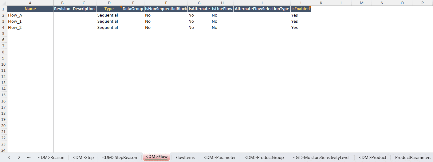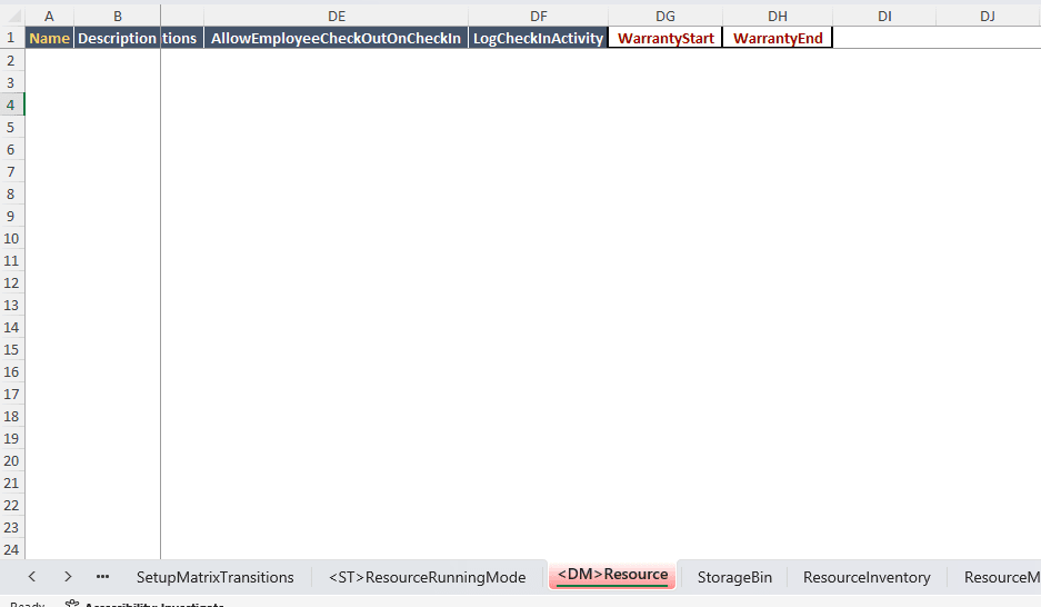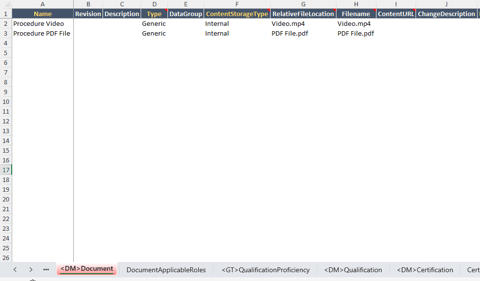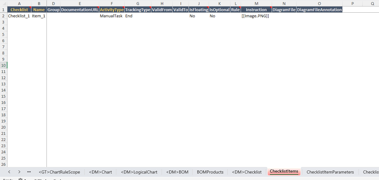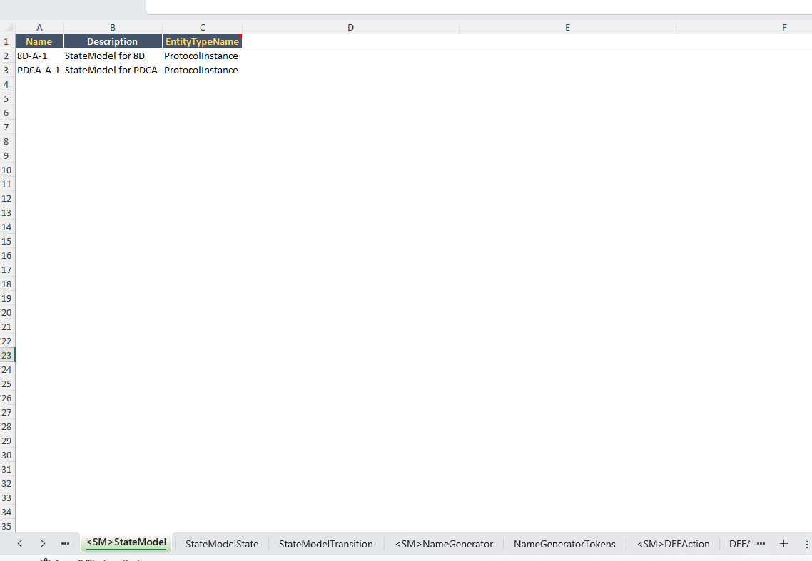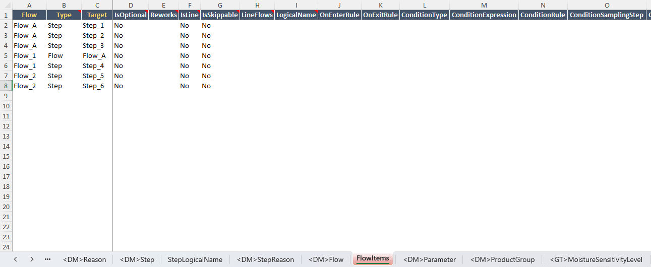 The name of the Excel sheets must match the MES entities being loaded and the name of the columns must match the entity properties exactly. When processing the data, the system will check if the object already exists, thus creating or updating it accordingly.
