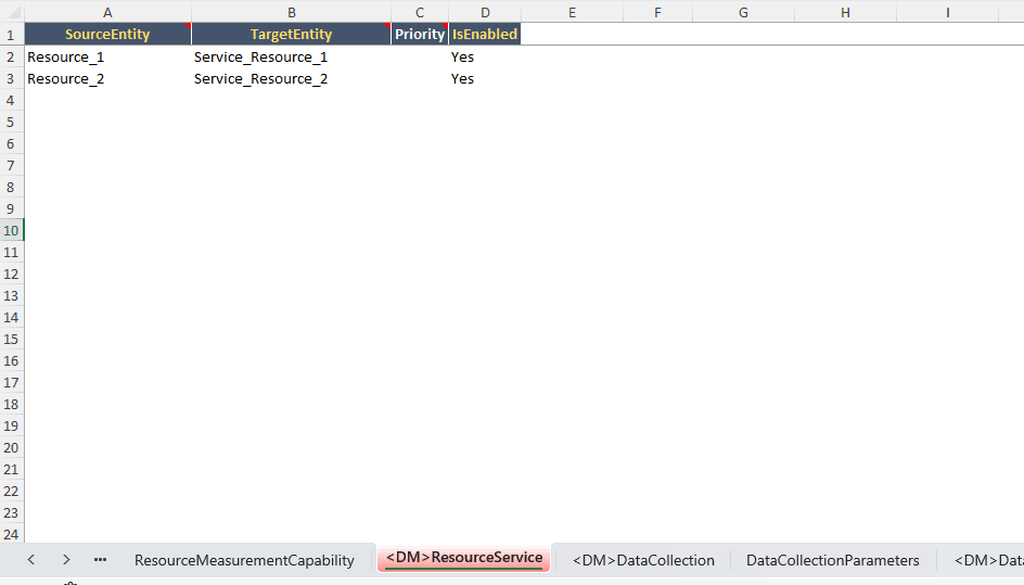 In another quick example, the Service must be created before the Resource creation and only after it is possible to fulfill the ResourceService sheet.