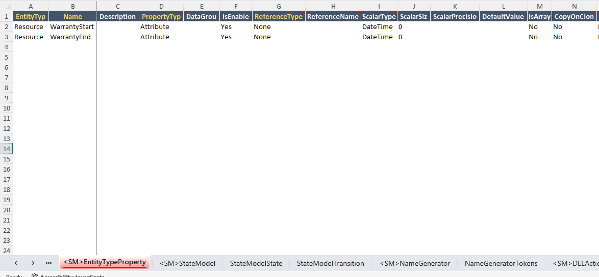 If you want to add specific attributes to an entity, you must create the attribute in the EntityTypeProperty sheet and then add the columns with the attribute names in the target Entity.