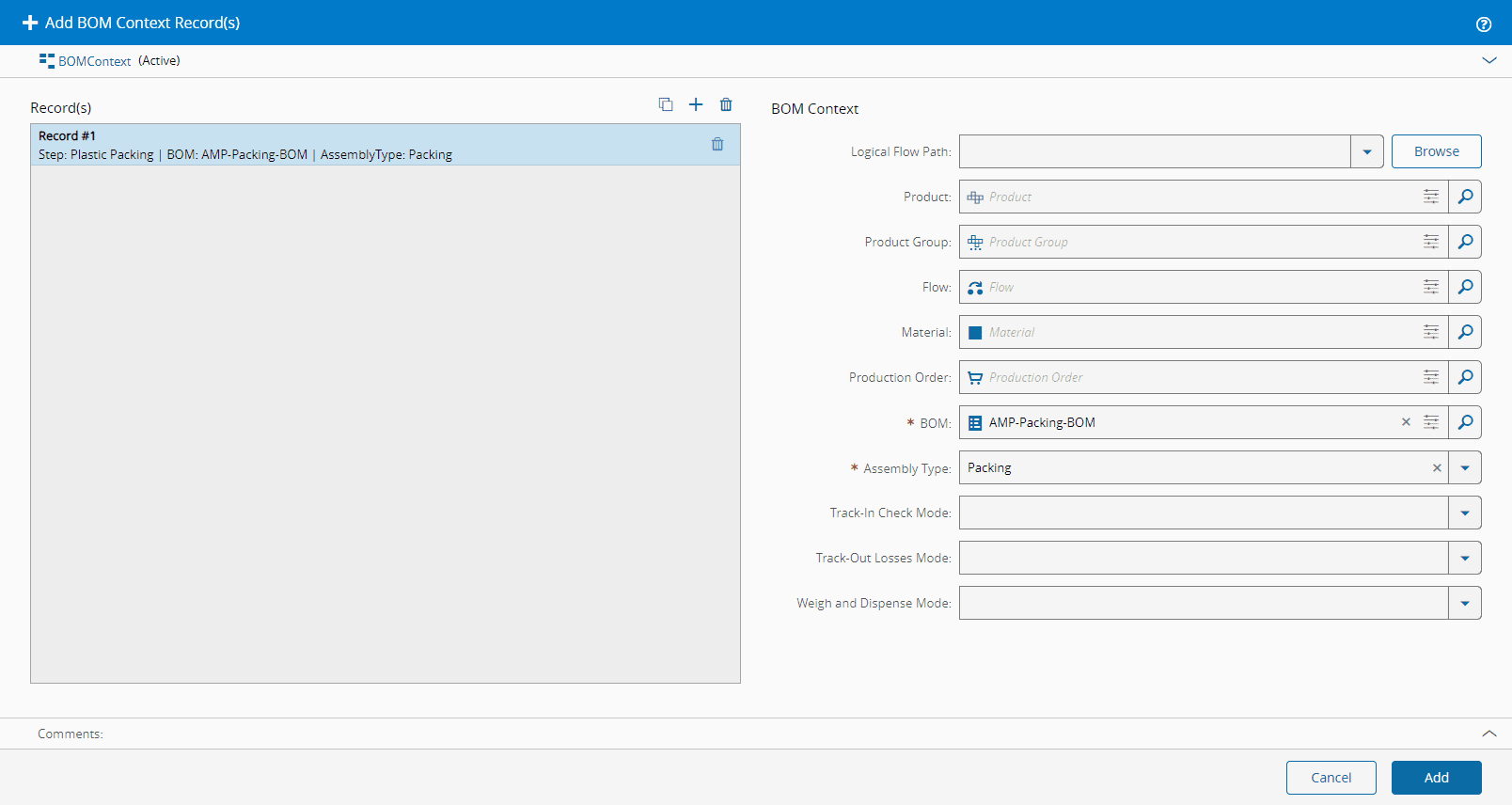 Configure the BOM Context in the packing step, which for this example is Plastic Packing: