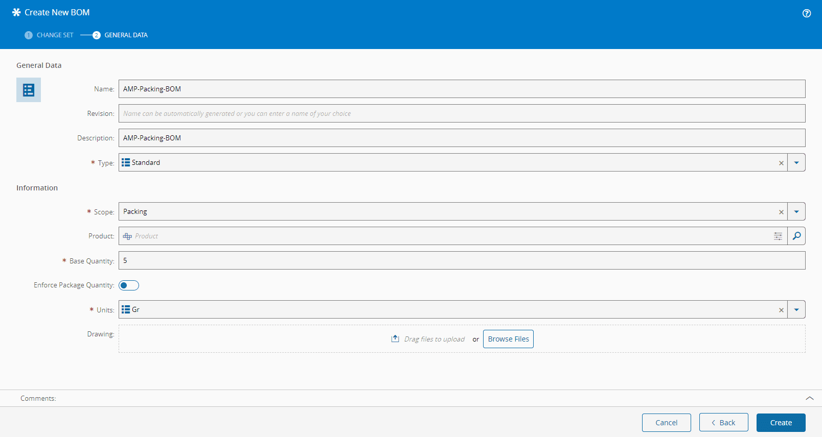 Create a BOM that must have Packing as its Scope, and the Units are as before: