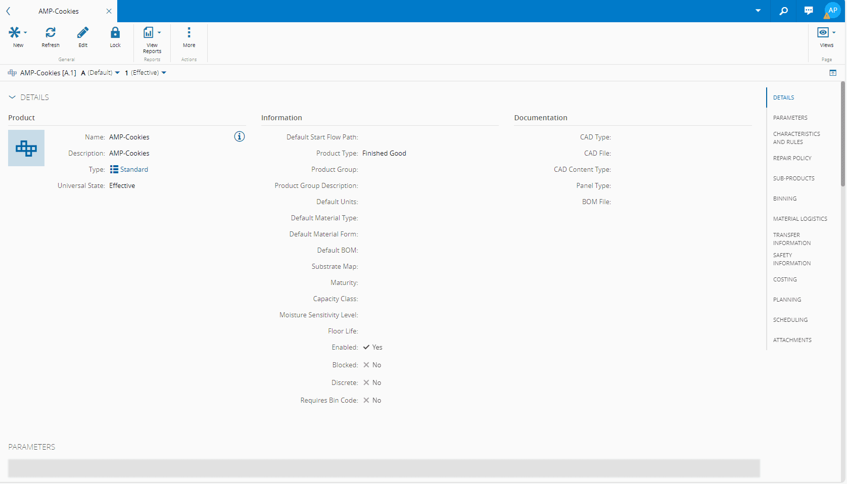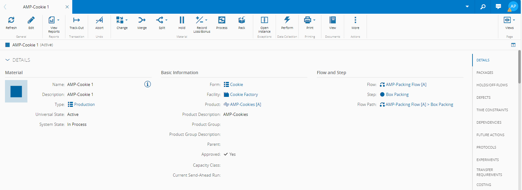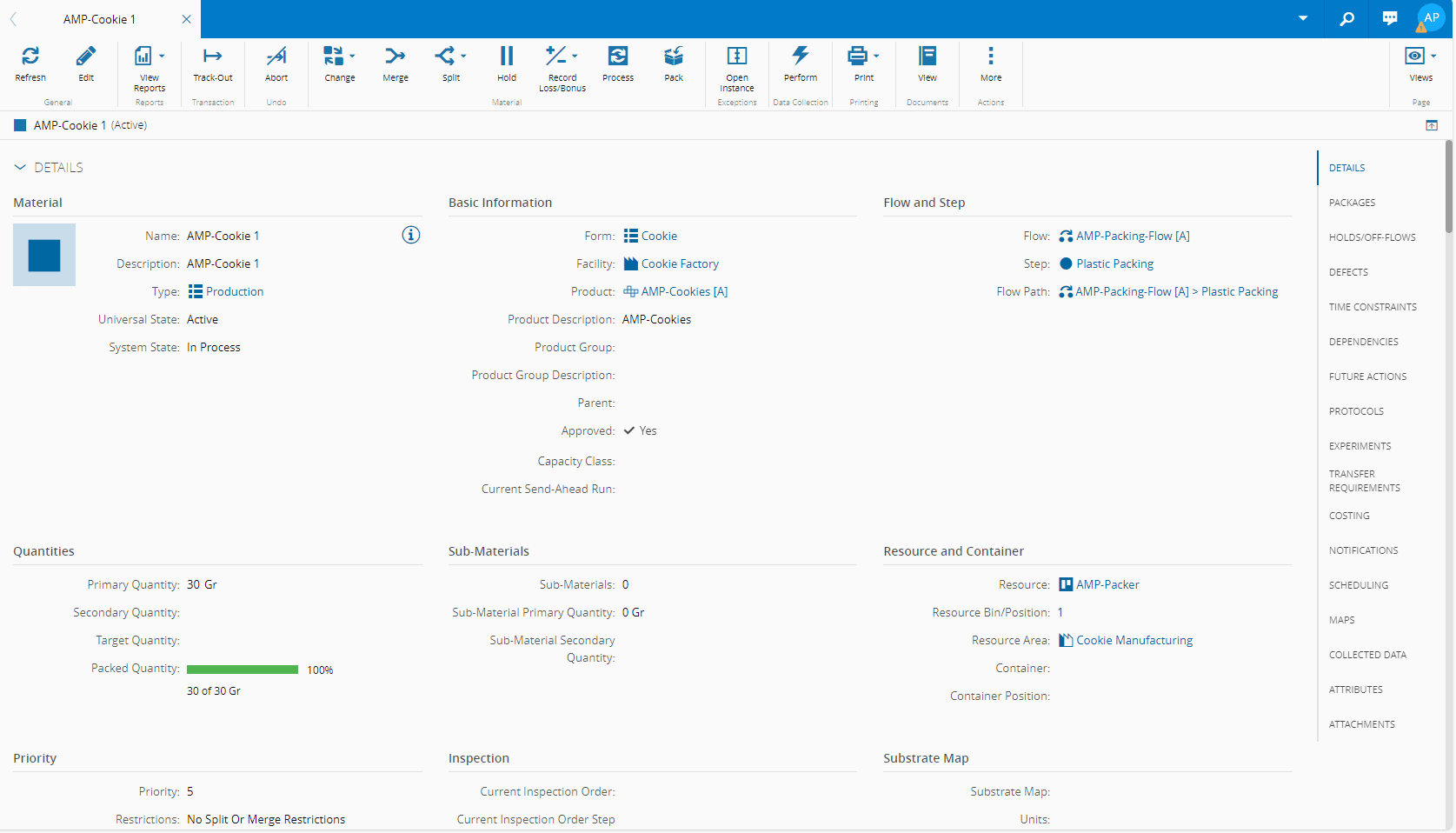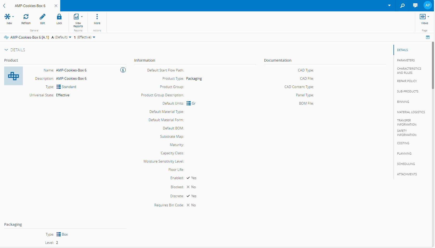 In the image above the cookie Material at Level 1 is already packed. This is, the Packed Quantity is 100%, and you can see its details by selecting the Packages section of this page.
