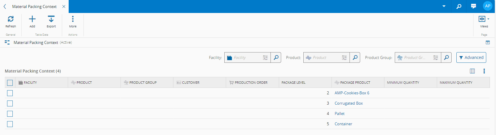 - Configure the MaterialPackingContext Smart Table to establish the Package Product that will tell you for a certain material context and packing level what is the specific box/package product to be used: