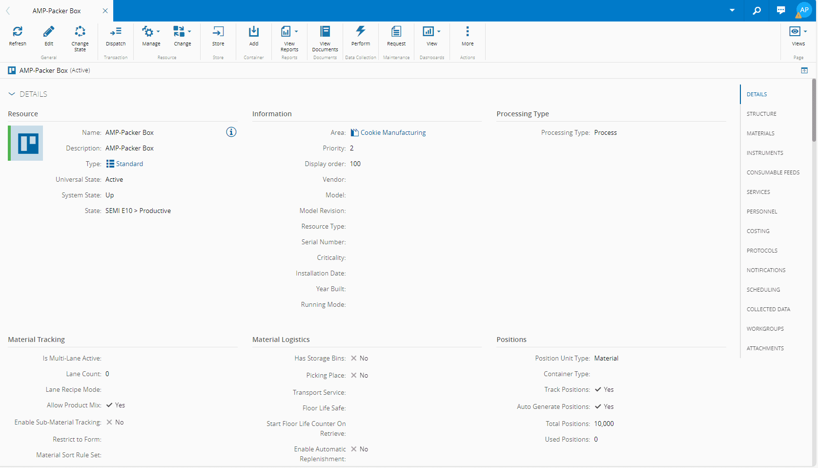 To test that Level 1 packing is working you should create a Material with the cookies Product, you need to make sure you have created a Material containing the cookies bag Product, and it is attached to the feeder Resource, or you can attach this consumable Material inside the packing wizard using the Insert Barcode function. Then Dispatch and Track-In your cookie Material. At this point the Pack button should be available in the top ribbon: