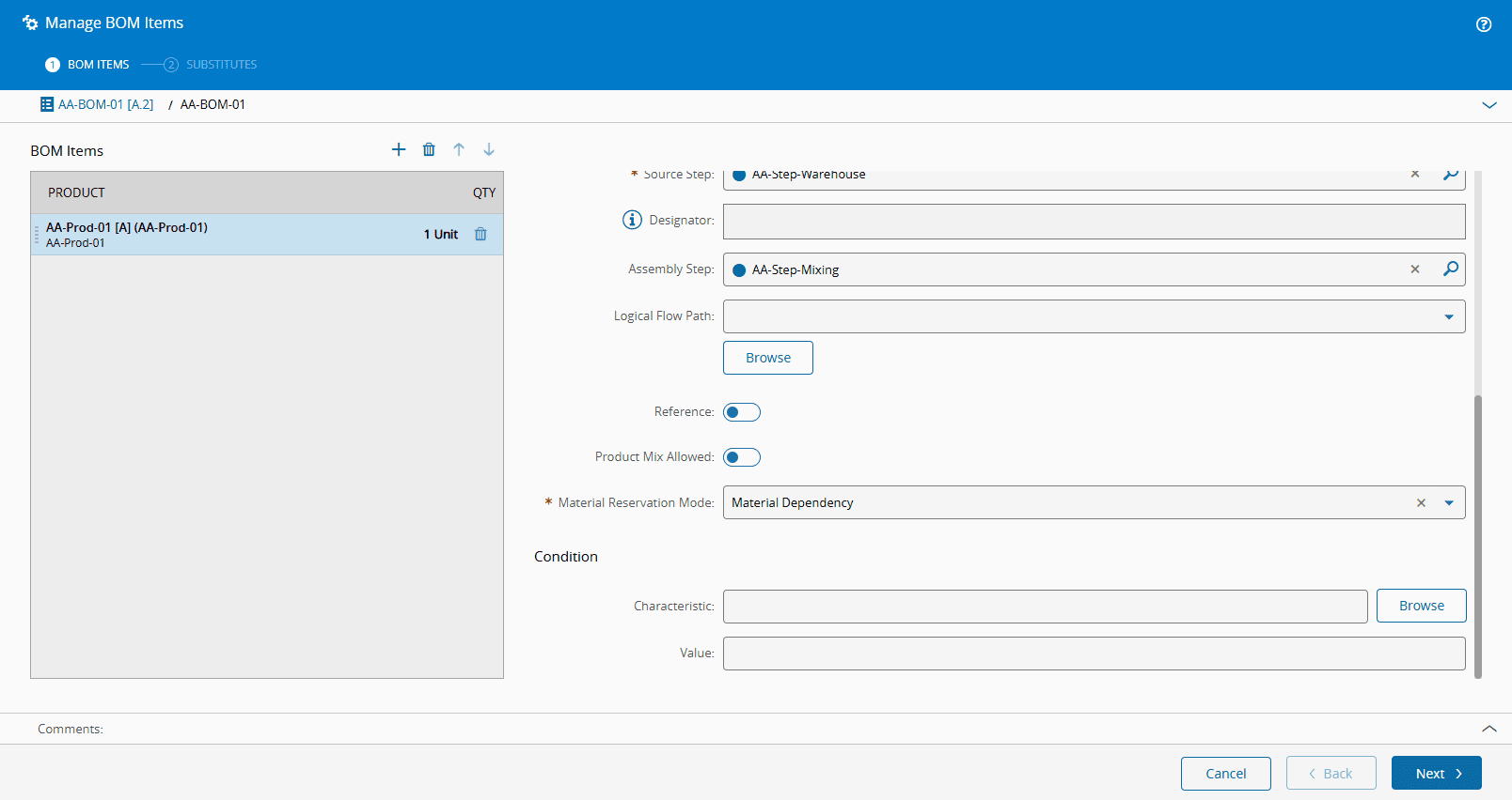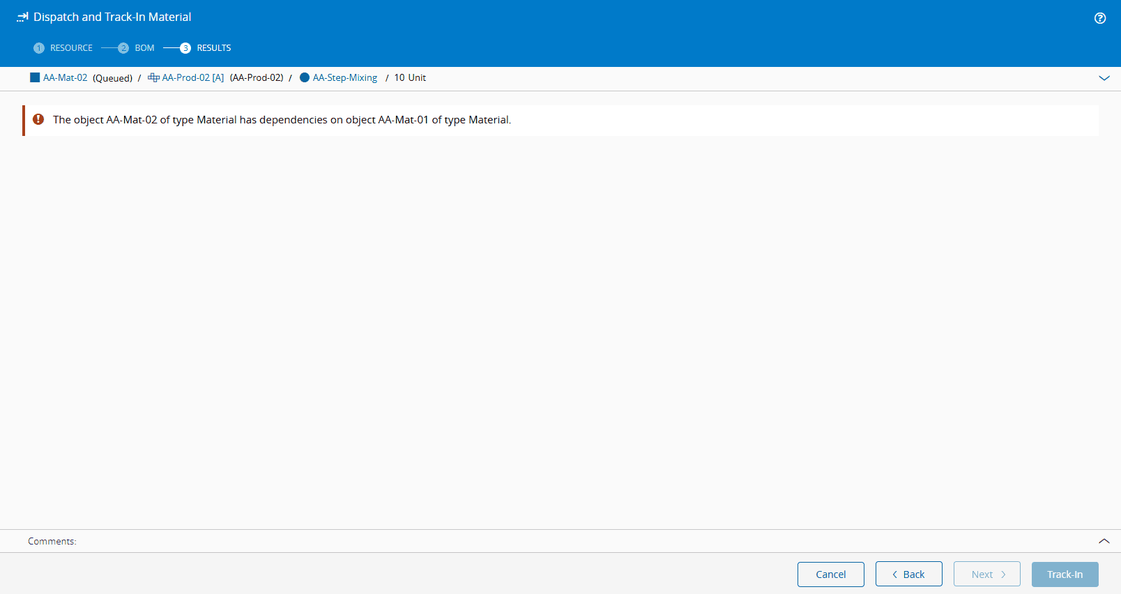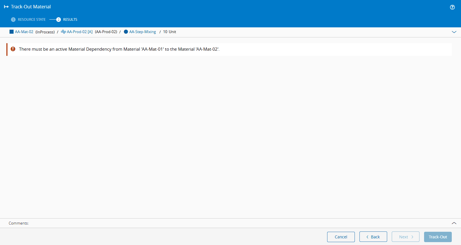 If you select Material Dependency for the Material Reservation Mode, but do not create a Dependency for the Material you want to produce, the system will return an error. In the example below, the AA-Mat-02 is the Material that is being produced, and it depends on AA-Mat-01 to provide it with its raw materials. As this Dependency was not created, the system will not allow you continue, and explains just that in the error message: Screenshot showing a material reservation mode selection with an error message indicating that no dependency was created for the selected material.