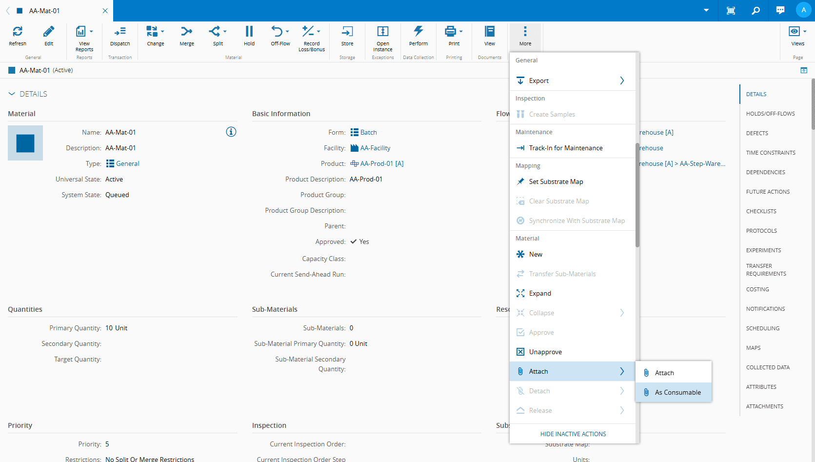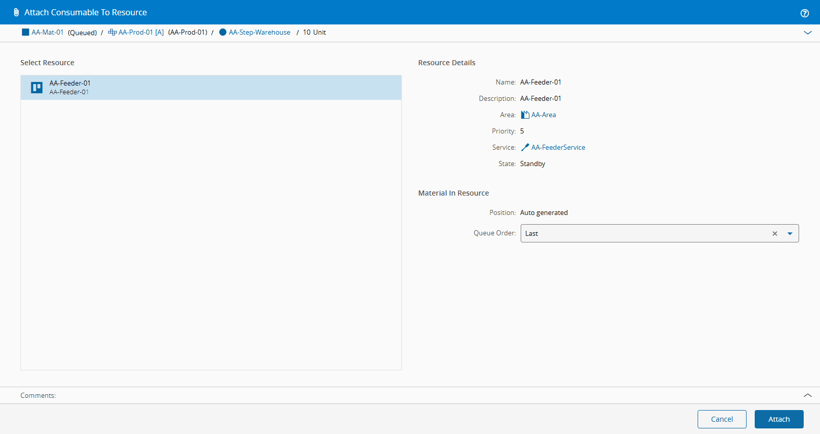 Screenshot showing an example of attaching material to a production order.