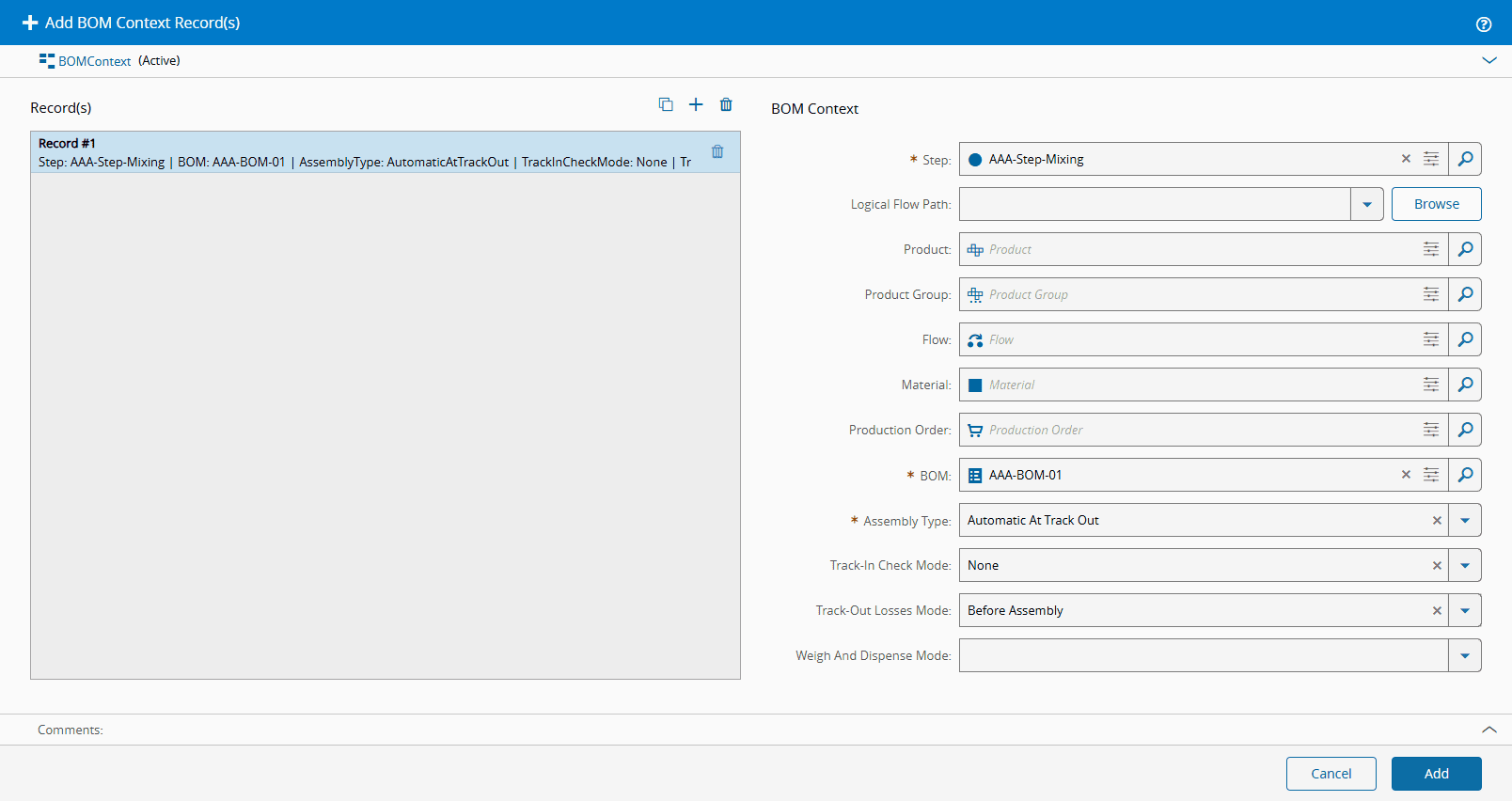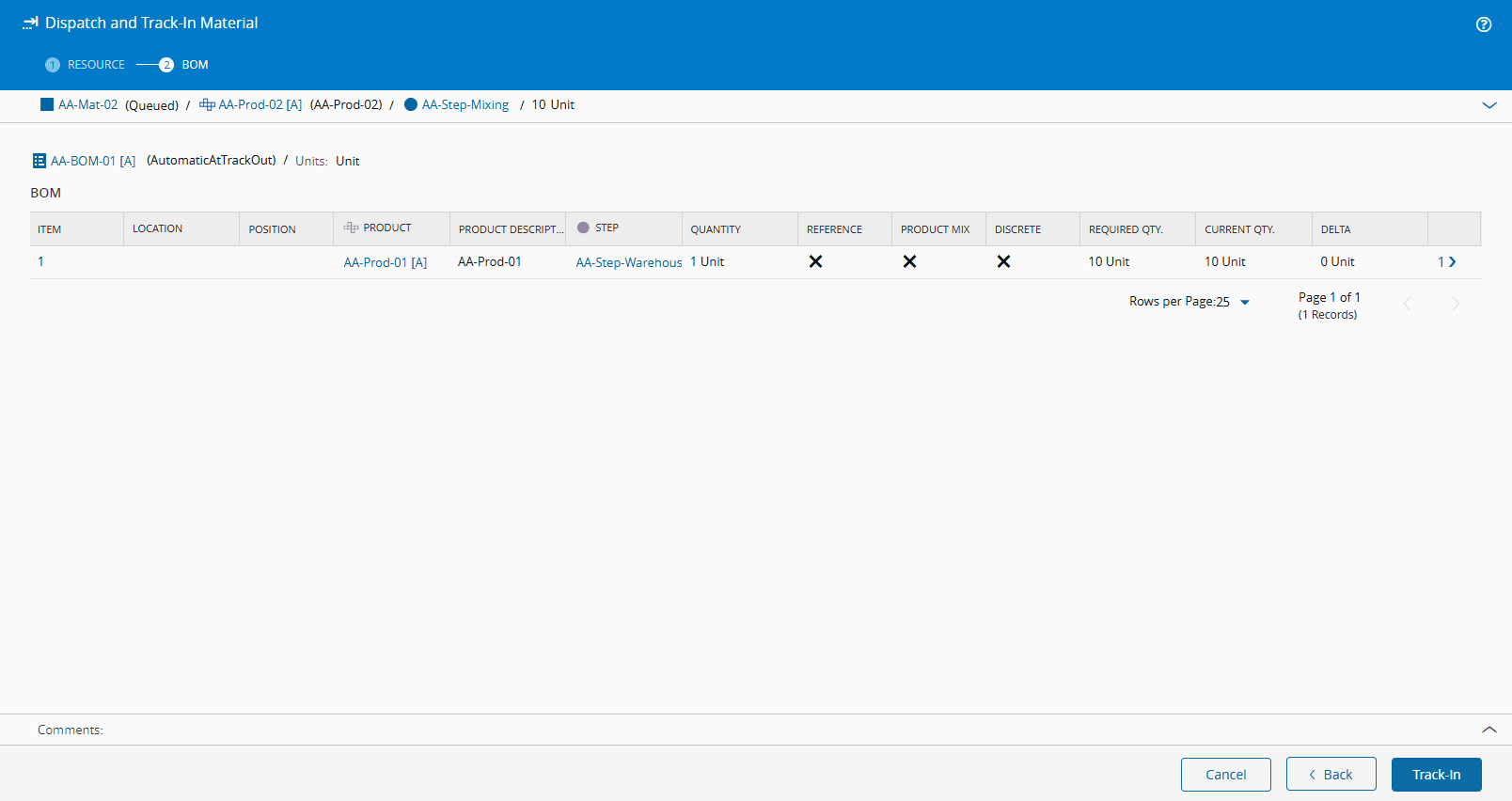 This step is only needed because in this example we set the assembly Type of the BOM as Automatic at Track Out.