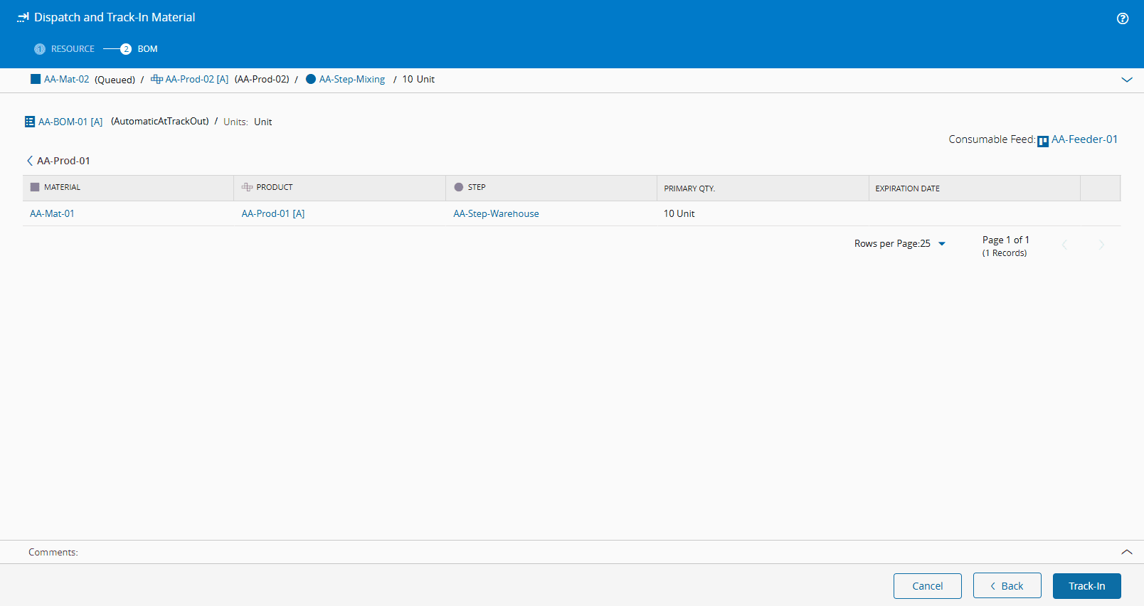 13. You can now Dispatch and Track-In your main Material and verify the BOM information:
