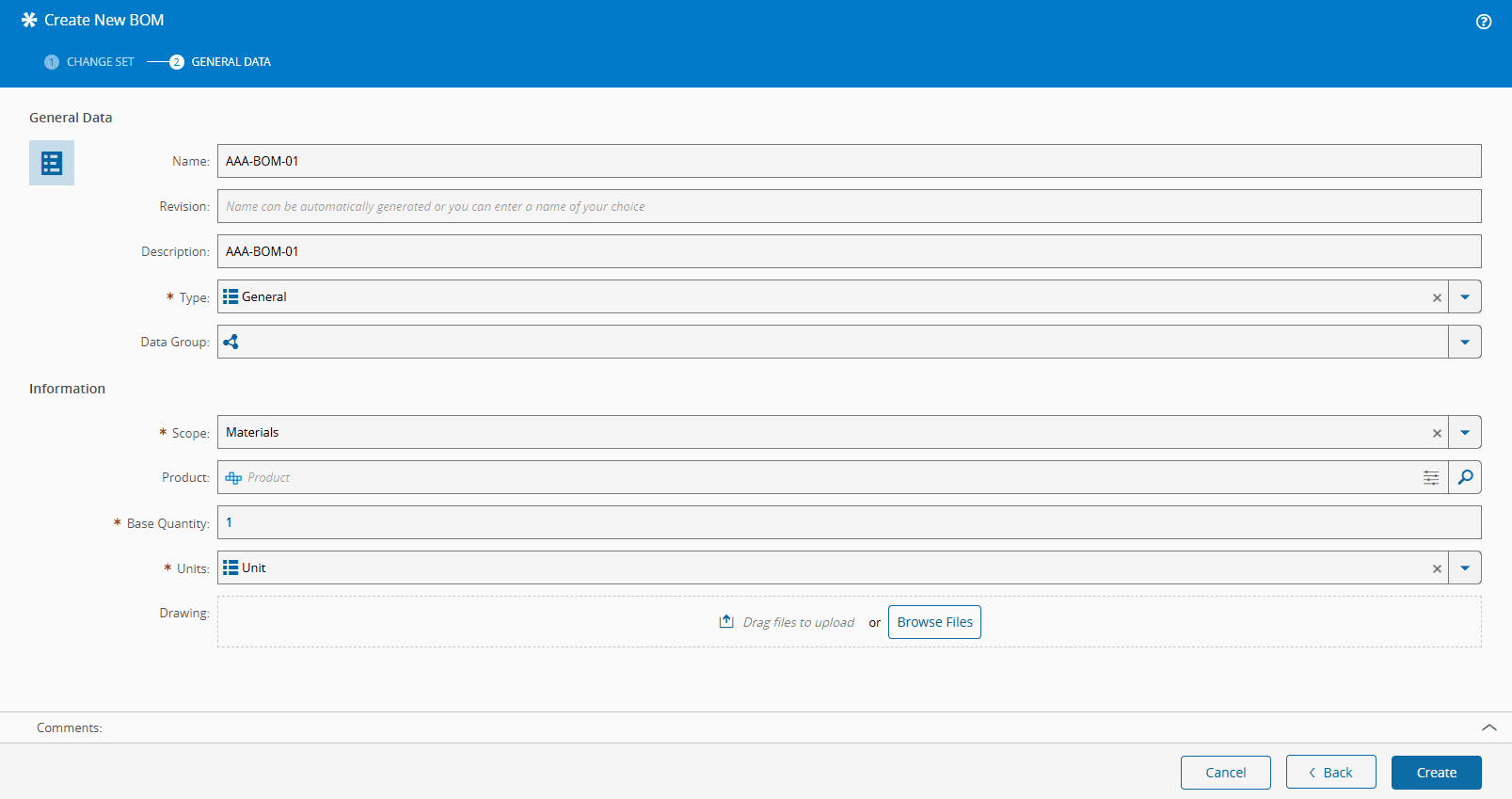 Screenshot showing a Bill of Materials (BOM) creation step with scope set to "Materials".