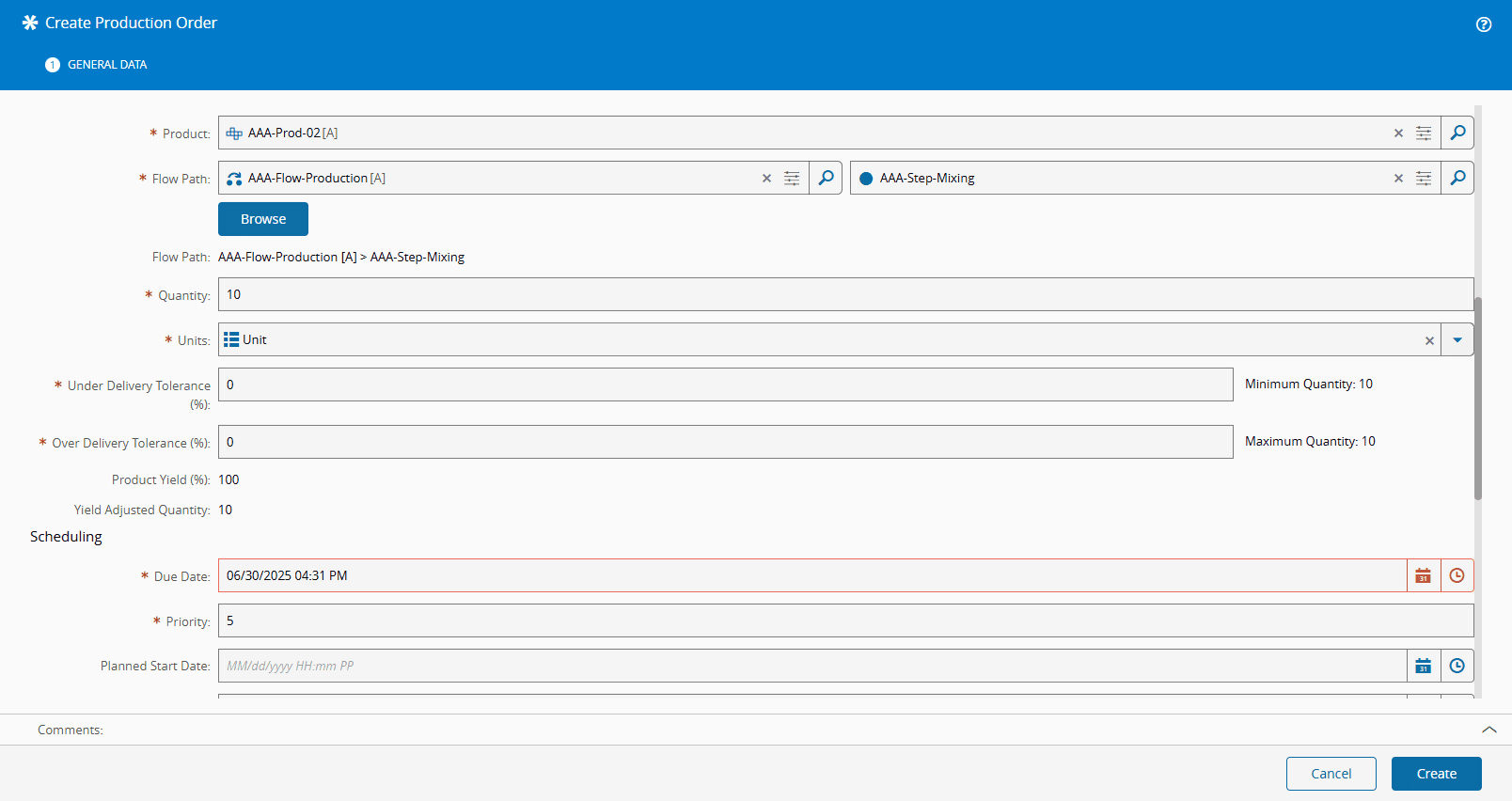 5. Create a Production Order with the Product to be produced and all the other necessary information: