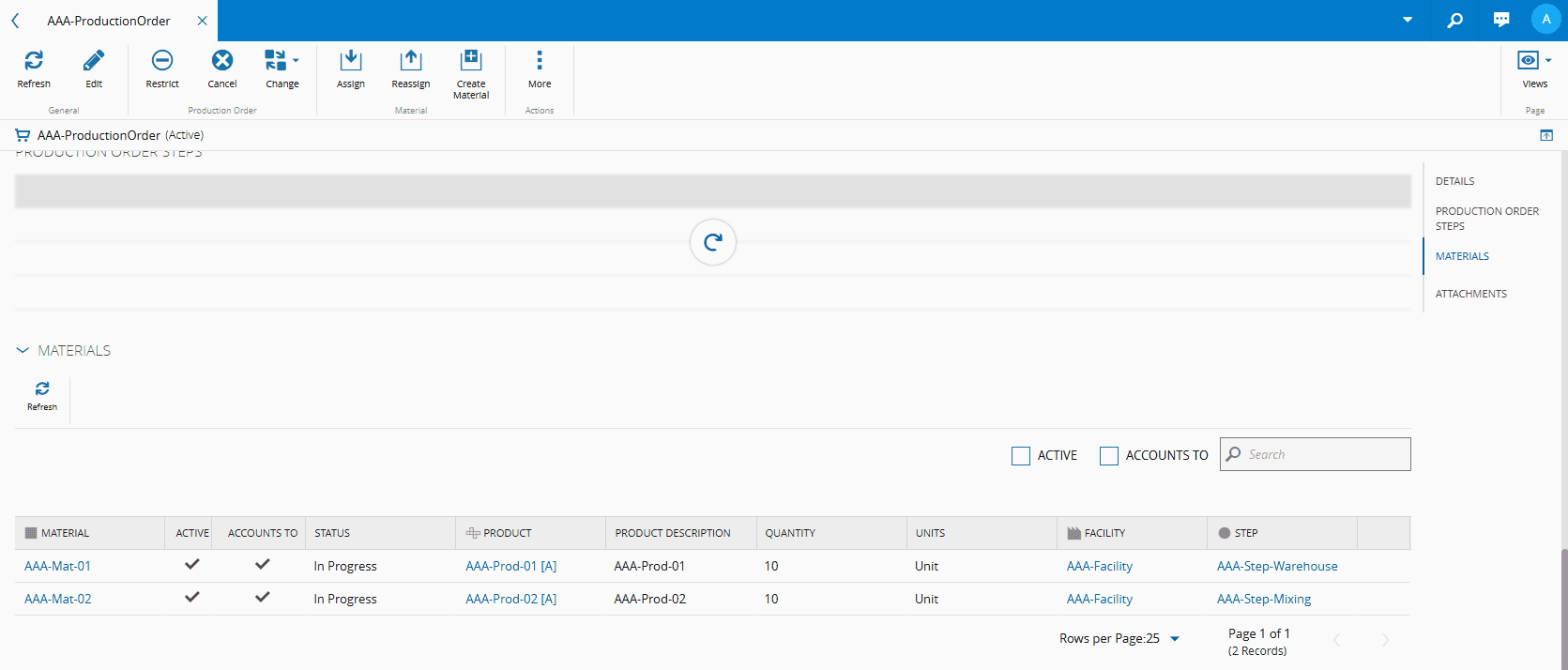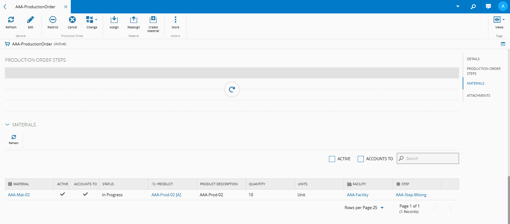 9. Select Assign and your Production Order will have the main Material assigned to it: