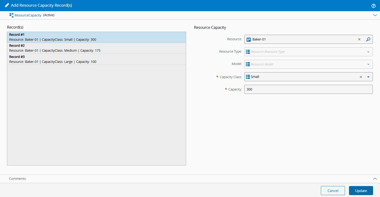 When adding a Resource Capacity record, specify the Resource, Capacity Class, and Capacity. The values for Capacity Class come from the CapacityClass Lookup Table, which must be populated before proceeding. For more information, see How to: Edit a Lookup Table.